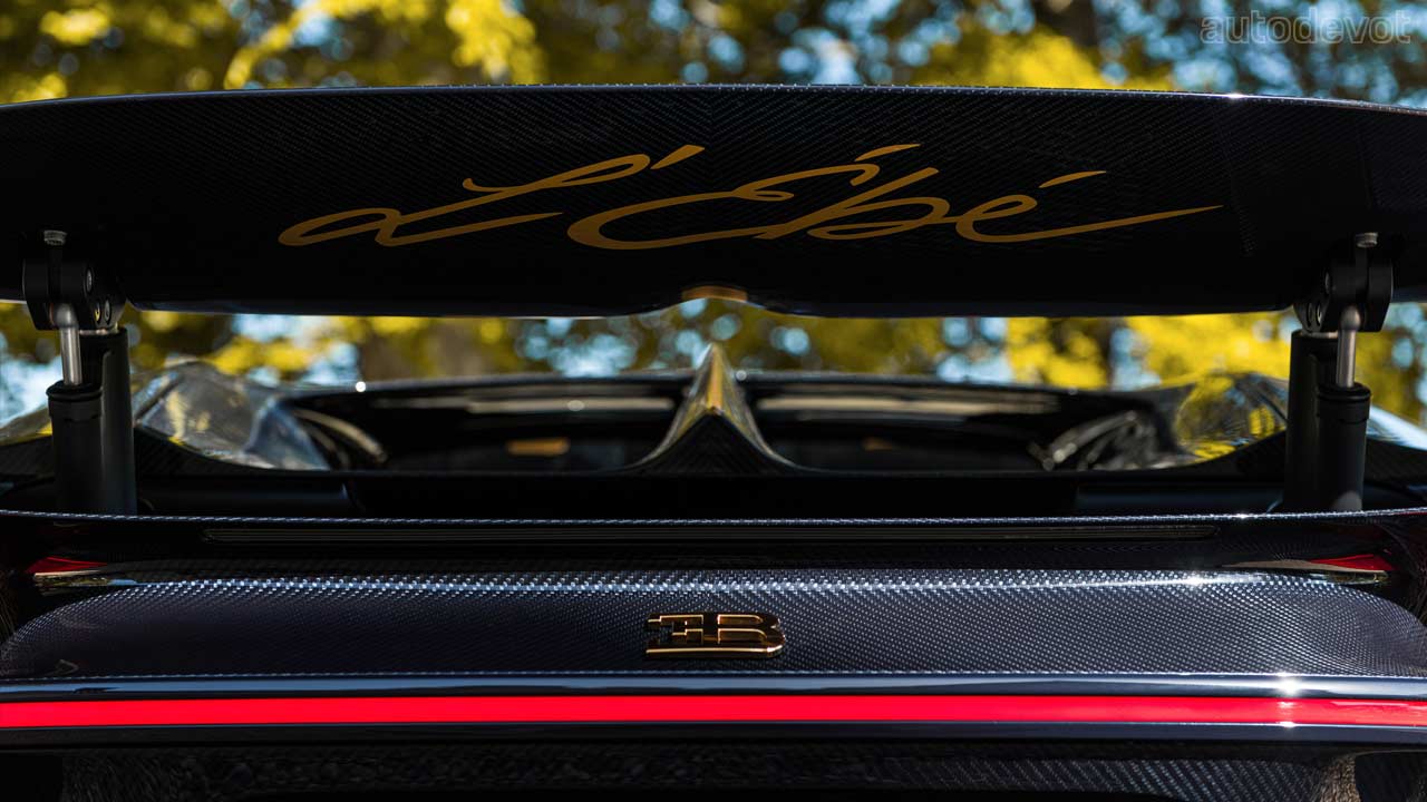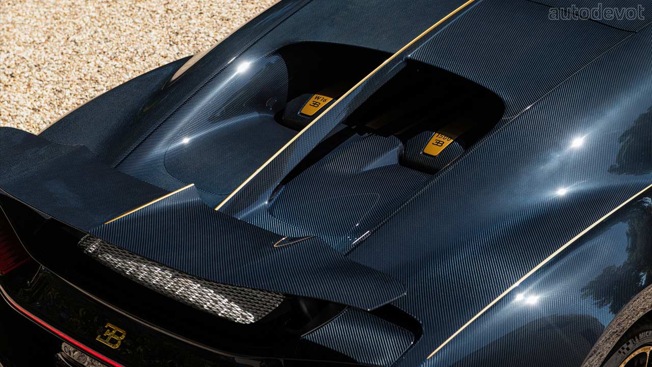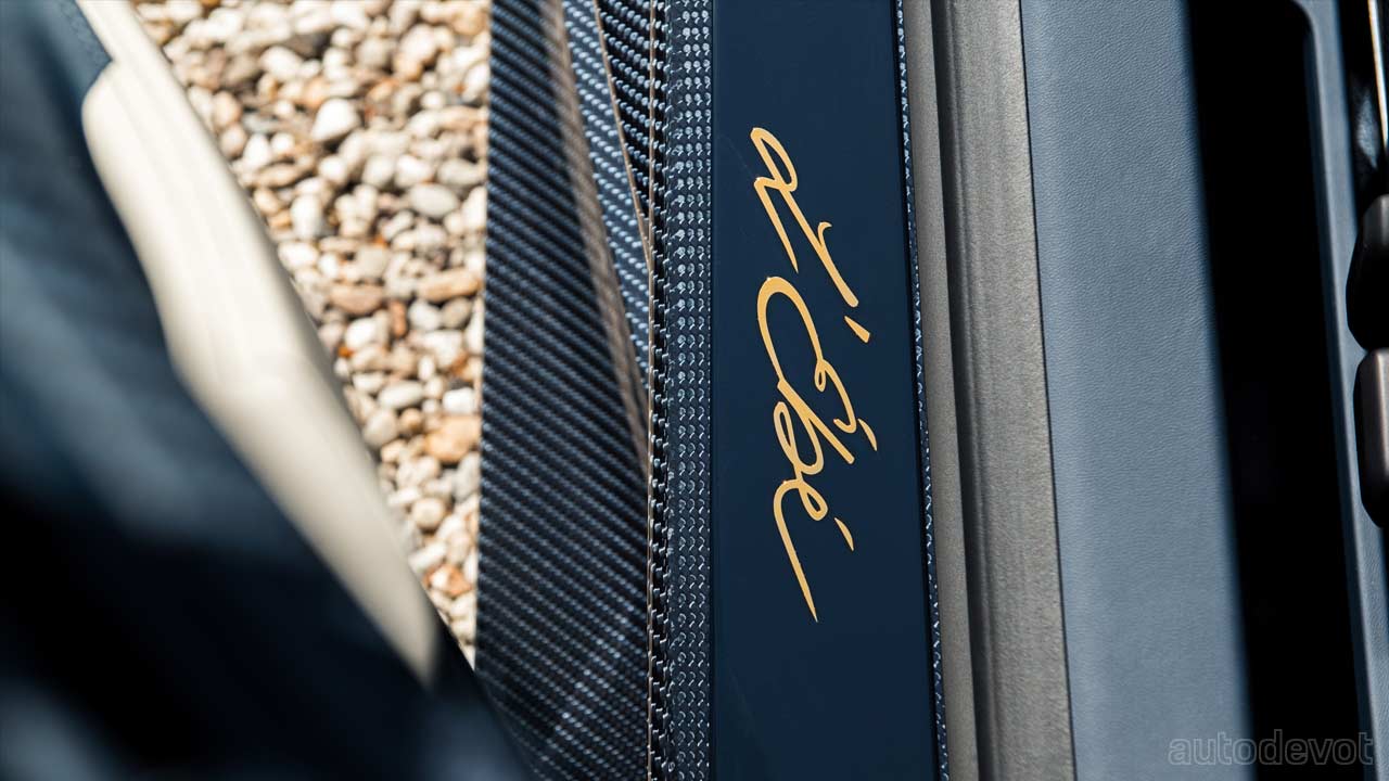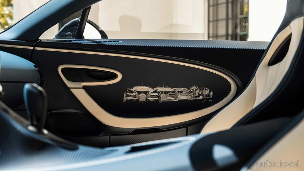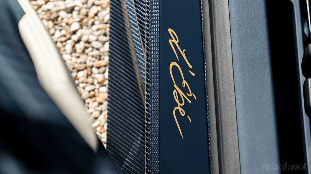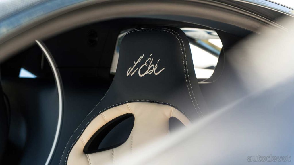 But anyway, both special editions feature highlights inspired by L’Ébé’s love for Art Deco. Chiron’s silhouette lines on the side are accented in gold, offering a shimmering contrast against the exposed blue-tinted carbon body. Gold highlights also adorn the “EB” badging, the famous horseshoe grille at the front, the 8.0-litre W16 engine’s badges, and of course, the wheels. L’Ébé’s signature logo hides subtly on the underside of the retractable rear spoiler, as well as on the treadplates and hand-stitched onto the headrests of the seats.