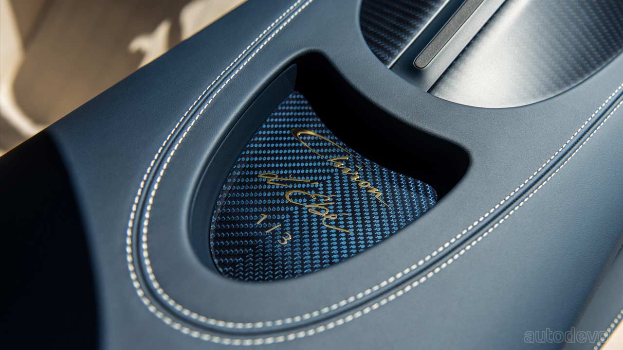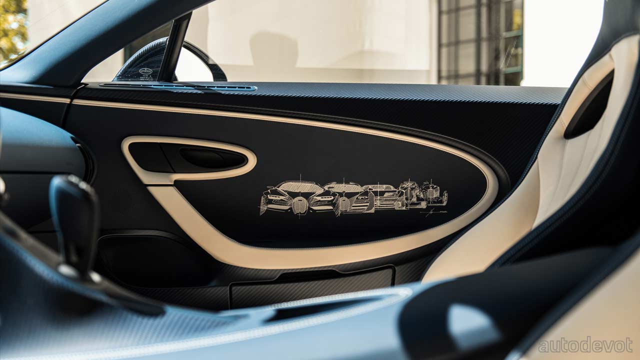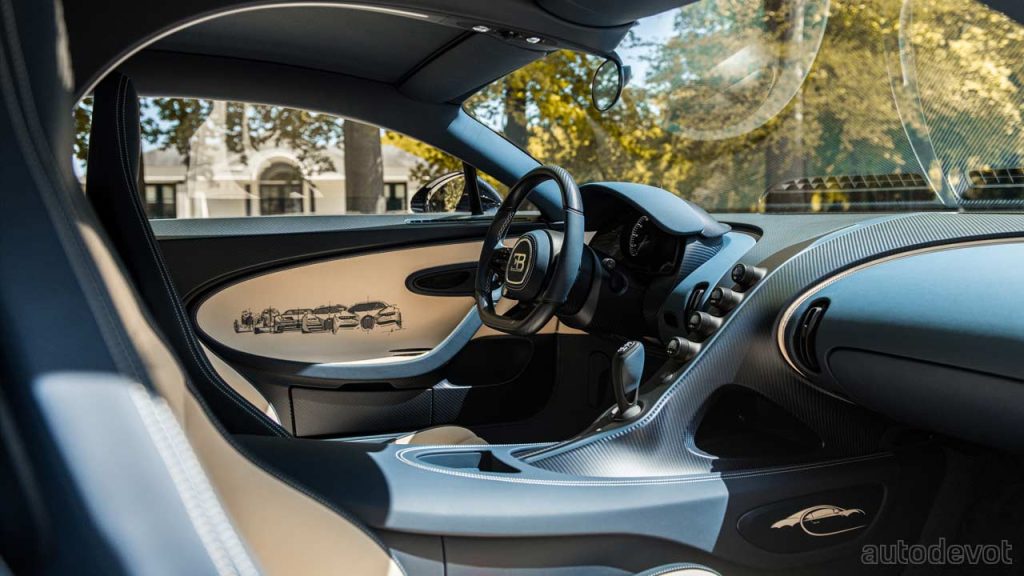 The cockpit subtly mirrors the exterior, with exposed blue-tinted carbon visible throughout, combined with “Silk” leather and subtle gold highlights. Notice that the door panels showcase the evolution of Bugatti cars; while the driver side door panel features the Lake Blue evolution motif against Silk leather, the passenger side reverses the color scheme.