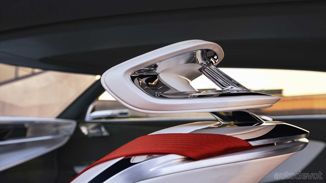 Inside, there are cockpit-style front seats with cantilevered headrests that appear to be floating, and a flat-bottom steering wheel that is truly flat and almost in a D-shape. And notice there are two extra displays for the outer rearview cameras. The overall styling on the inside looks rather busy and complicated with multiple layers and materials. In addition to a large display on the dashboard, the floating centre console also has another display. AI and biometrics are being used to personalize the vehicle to its occupants. If an increased heart rate is detected in the driver, for example, the vehicle can automatically tweak some settings to calm down the driver. The Zen Mode, for example, dims the cabin lights, disperses calming aromatherapy scents and activates massaging seats.