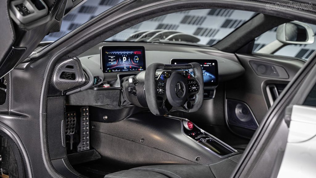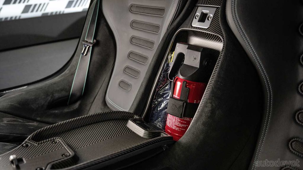 Inside, there are two “firmly fixed” racing seats, but the backrests can be adjusted to two positions: 25- and 30-degree angles. The steering wheel is electrically adjustable and the pedal box is mechanically adjustable in 11 steps. And of course, the passenger footrest is also individually adjustable, so that they won’t bother you while you’re enjoying your track day.