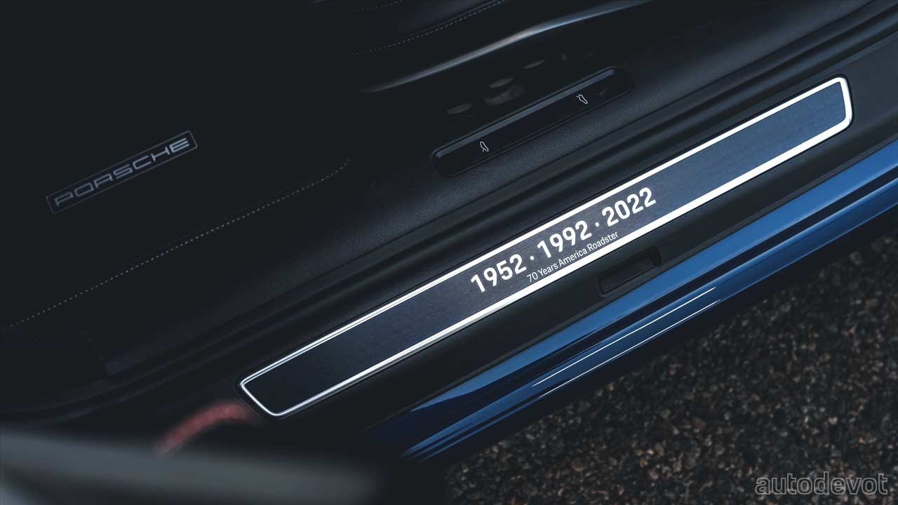 Cross stitching in Guards Red with surrounding stitching in Pebble Grey continues the color combination through the cabin, including along the upper dashboard and door panels. The central armrest features two-tone stitching in Guards Red and Pebble Grey, with embossed ‘America’ branding on the leather. Unique illuminated door sills commemorate the 70th anniversary of the 356 America Roadster. An optional extended interior package continues the color theme on the steering wheel, shift lever and seats as well. The tachometer dial is gonna be in white as standard.