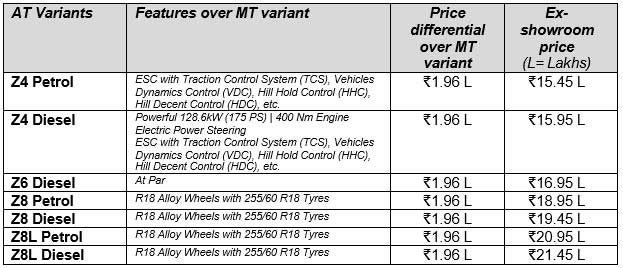 As for 4WD variants, they are available only with the diesel automatic powertrain at a premium of INR 2.45 lakh over the respective 2WD variants. That premium is, again, introductory, and will be revised soon. The 4WD will be available on Z4, Z8, and Z8L trims. Full variant list below with ex-showroom prices: