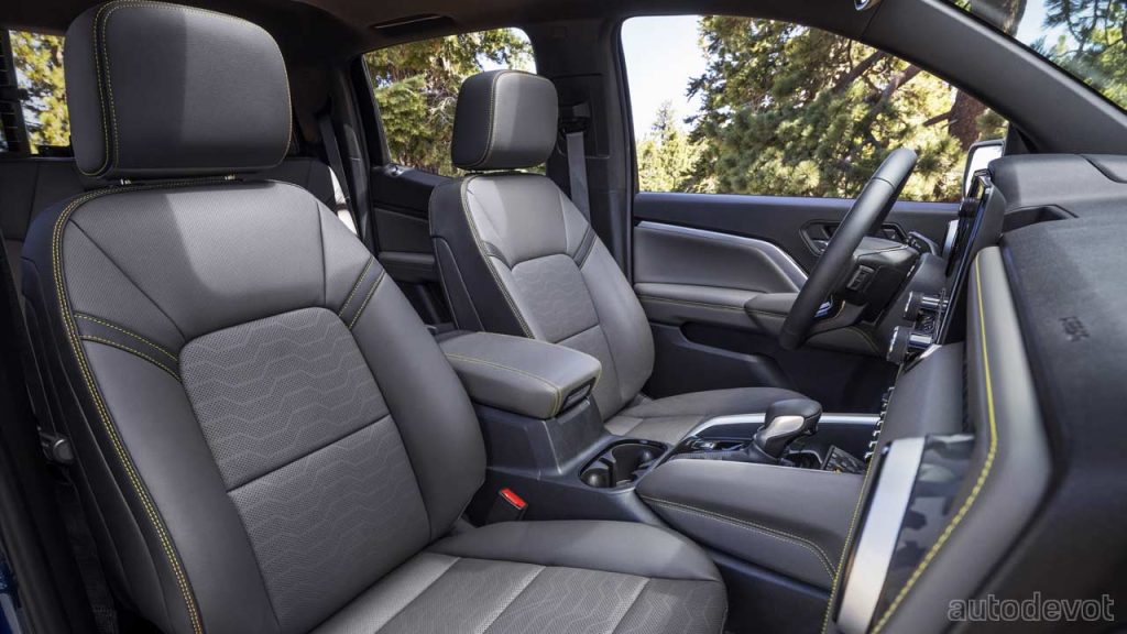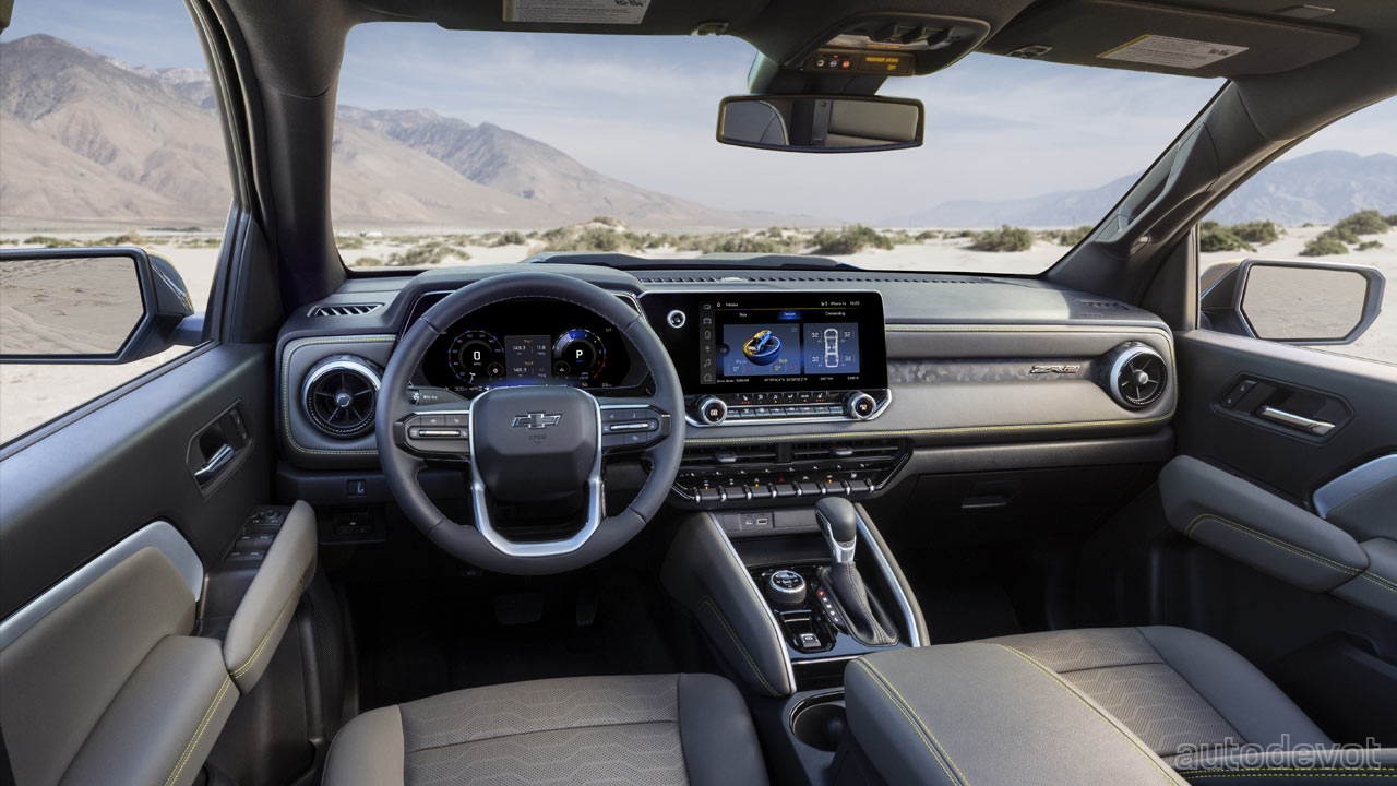 The 2023 Colorado trim lineup includes WT, LT, Z71, Trail Boss and ZR2. The new Colorado lineup looks sharper, muscular and a li’l bit aggressive compared with the relatively softer surfaces of the outgoing model. The Work Truck or WT for short, looks very basic and comes with 17-inch wheels with all-season tires. The LT looks better with body-colored bumpers and door handles, and 17-inch alloy wheels. The Trail Boss and Z71 are off-road focused models with the former boasting a 2-inch factory lift; both these also boast a 2-speed transfer case; 18-inch aluminum wheels wrapped with all-terrain tires; four selectable drive modes (Off-Road, Terrain, Tow/Haul, Normal), and off-road performance page in the central infotainment display.