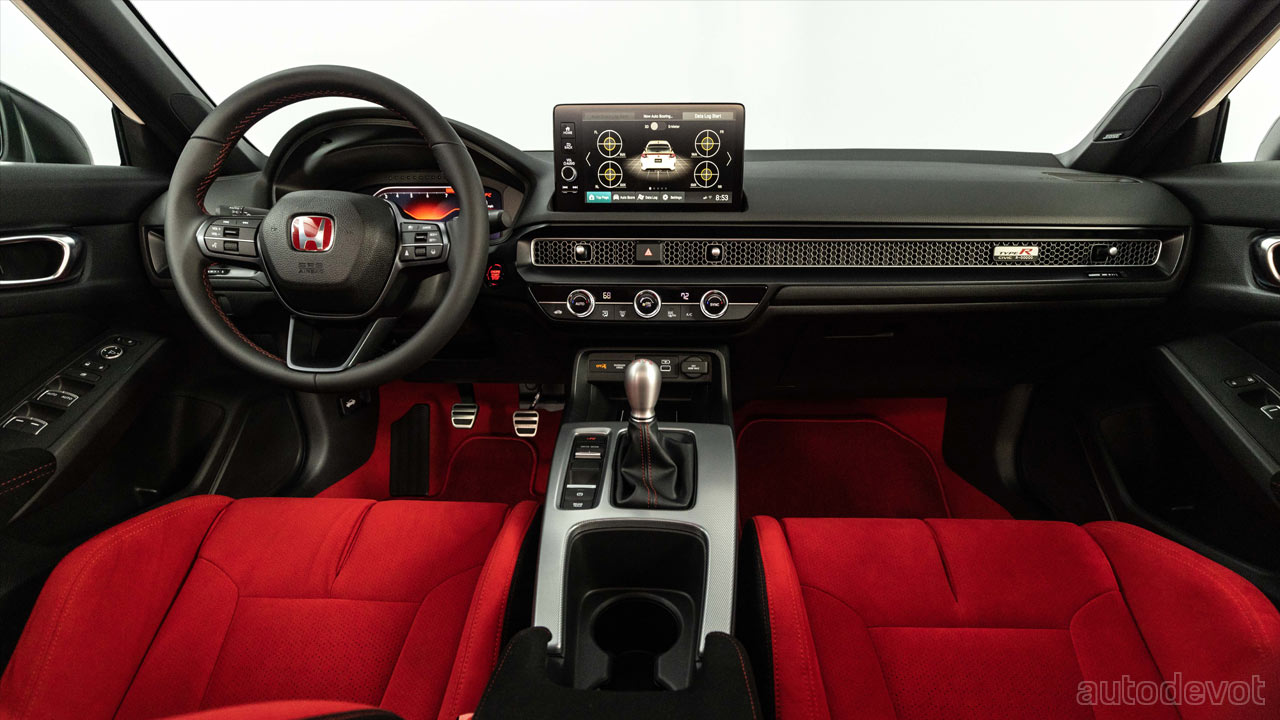 Also, notice the Type R numbered plaque on the passenger side of the dashboard. Other key features include the Honda LogR data logger that offers real-time information on the mechanicals of the vehicle and vehicle behavior resulting from the driver’s input; a stopwatch to record lap times; the ability to share driving videos, and special graphics in the instrument display when you select the +R driving mode.