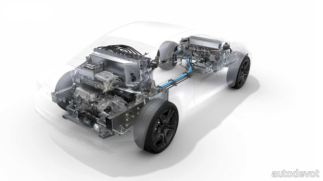 Inside, except for that large gaping hole on the roof, the A110 E-ternité looks just like any other Alpine A110 out there. However, there’s a larger central touchscreen and different materials as well. There’s also an 8-speaker audio system. But enough about the roof hole and materials and touchscreen cr*p, tell us about the powertrain! Well, I’m glad you asked.