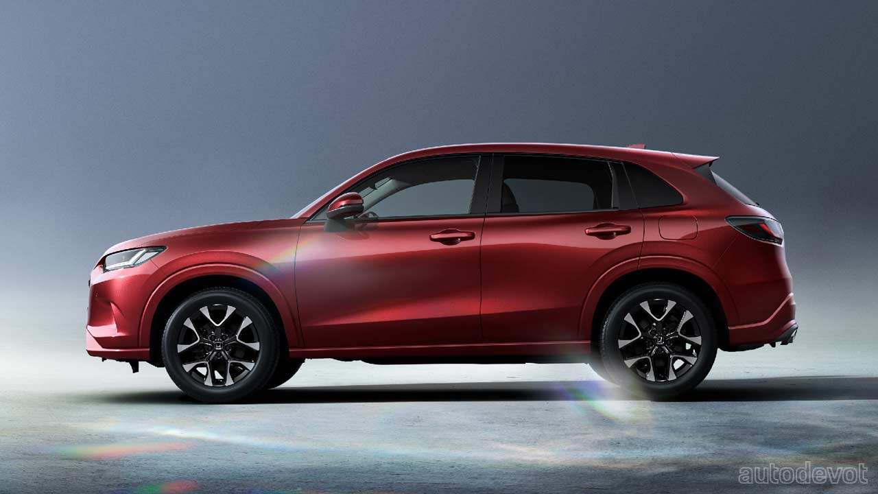 There is some visual differentiation compared with the U.S.-spec HR-V we saw over a month ago. These would include the front bumper, the grille pattern, the rear bumper with trapezoidal tailpipe finishers, and of course, the wheels. The example we’re seeing here appears to be the range-topping ‘Z’ AWD variant (e:HEV Z 4WD), finished in Crystal Garnet Metallic (translated from Japanese).