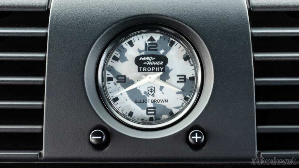 The exterior of the Defender Works V8 Trophy II features a black and white theme, complemented with expedition-inspired camouflage that features 23 locations where Land Rover has conquered challenging terrain across more than 70 years of off-roading. Other key highlights include a winch at the front; a powerful full-width LED light bar over the windshield; a rear recovery point; a rear ladder, and an external roll bar for added body protection.