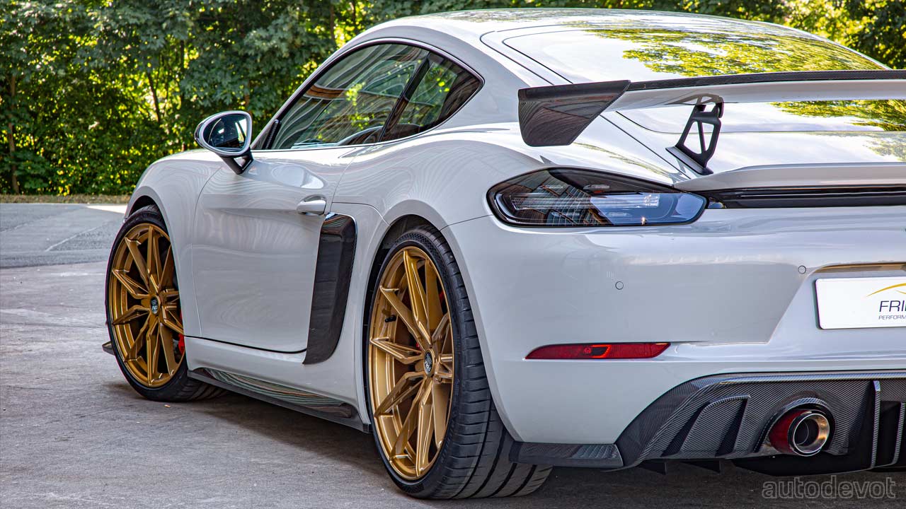 Friedrich takes the stock Cayman GT4 and decorates it with naked-carbon aero parts, such as the front spoiler, bumper side intake inserts, front canards, rocker panels on the side, rear diffuser inserts, and of course, the rear wing inserts with gurney flaps. The stock wheels are swapped for bronzish-gold colored ten-spoke wheels measuring 20-inch at the front and 21-inch at the rear. Friedrich also offers three different coilover suspensions for lowering the ride height by up to 45 mm while also firming up the damping.