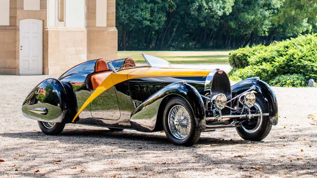 The curved windscreen + side windows form a visor-like design, which is a modern take on the Grand Raid’s V-shaped windscreen. The two-tone colors are also inspired by those on the Type 57 Roadster Grand Raid.
