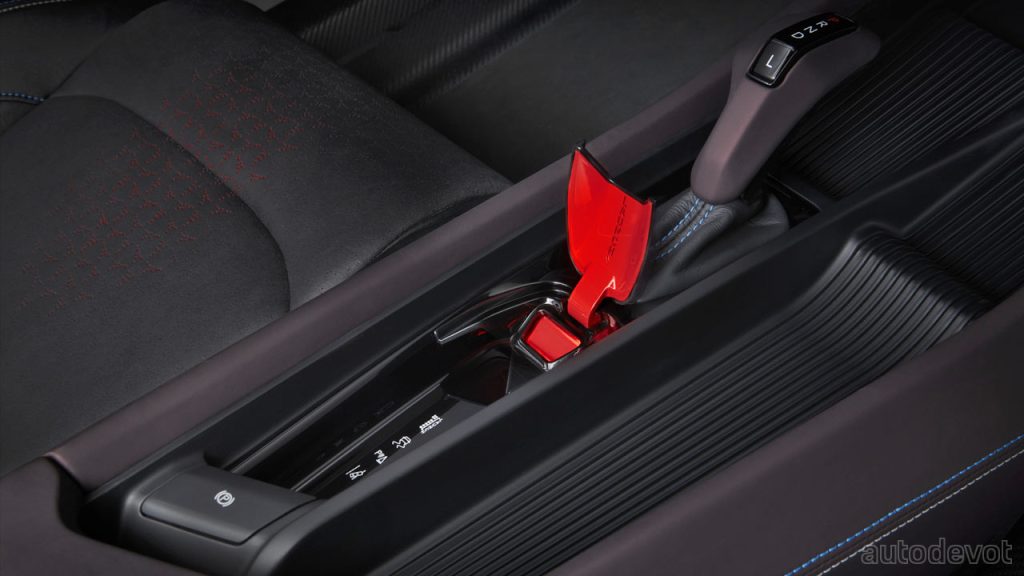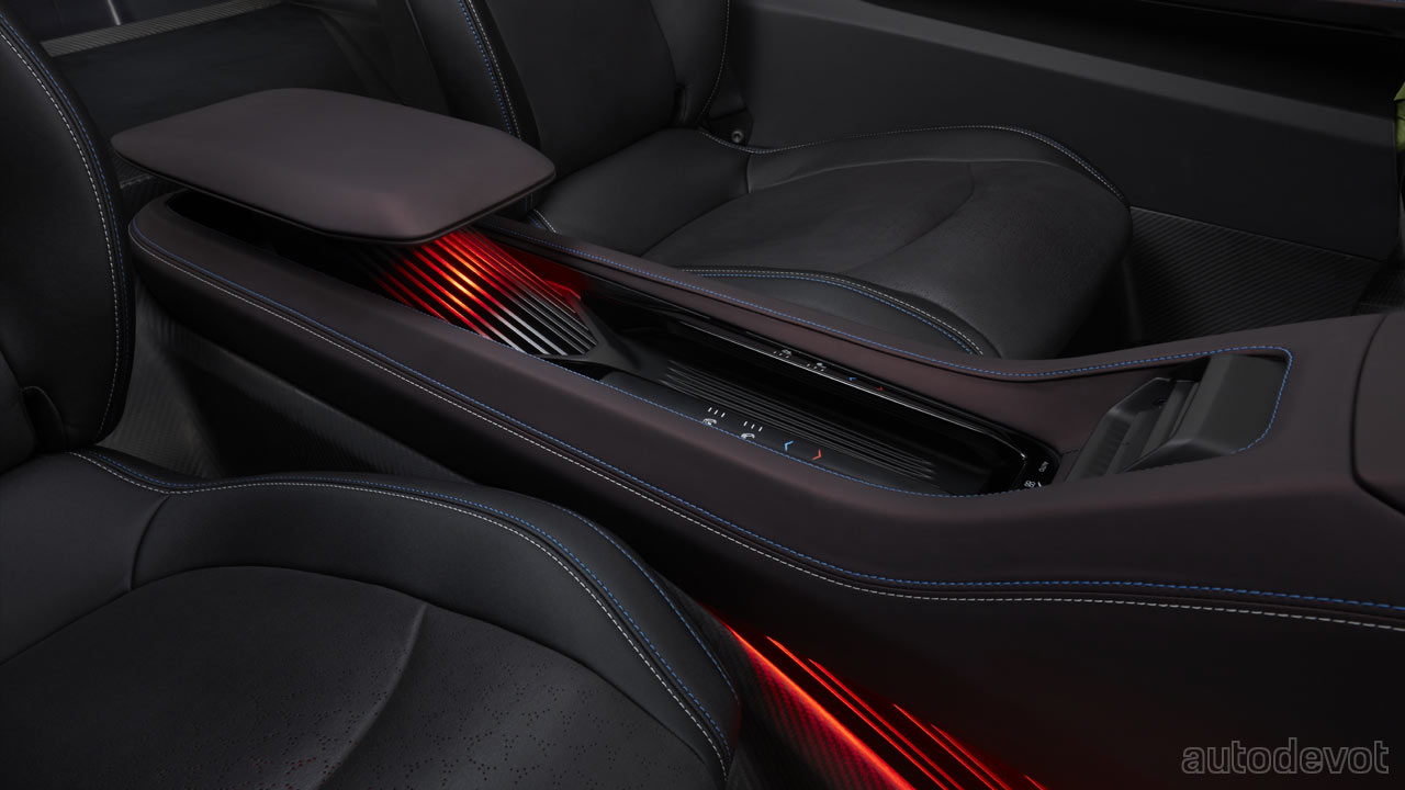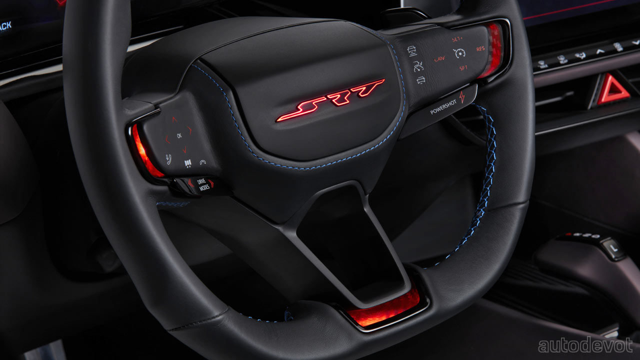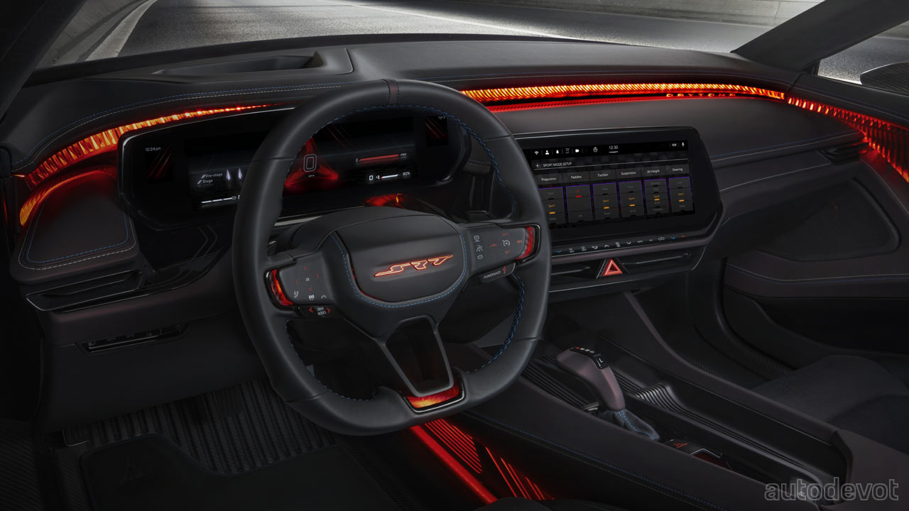 The racy cockpit boasts an SRT-branded flat-bottom steering wheel with lots of buttons including a ‘PowerShot’ button which apparently “delivers an adrenaline jolt of increased horsepower for a quick burst of acceleration”. And of course, you can’t miss that jet-fighter-inspired cap you need to flip up to engage the start button. Other key highlights include a 12.3-inch central touchscreen, the largest featured in a Dodge vehicle, a curved 16-inch instrument cluster, an 8-by-3-inch Head-up Display, and of course, race-inspired seats with carbon fibre shell.
