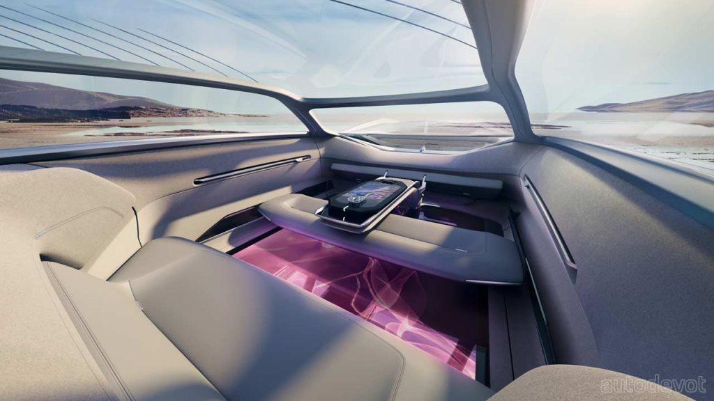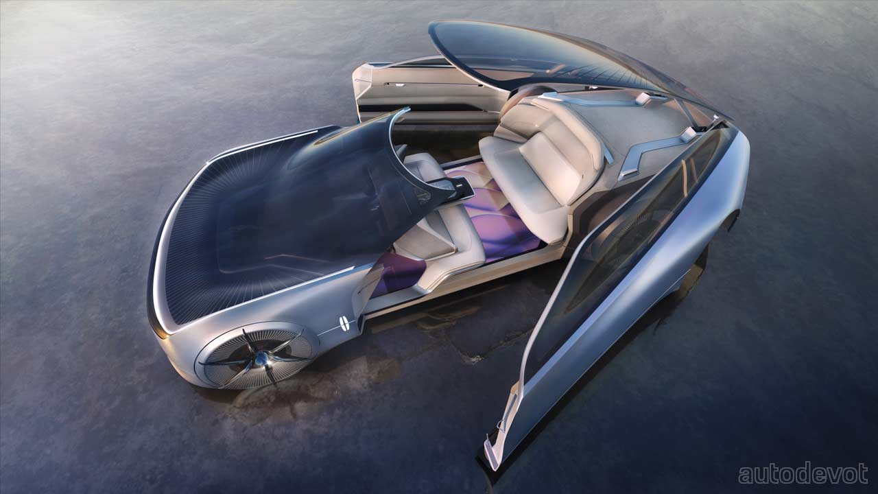 For the doors, I guess you could say that the designers have gone a bit bonkers, because the entire side of the vehicle opens, and of course, the doors are rear-hinged. The glass roof opens as well, but not like in a convertible way; it is also rear-hinged. Recycled and animal-free materials adorn the cabin. The floor is apparently digital and works in conjunction with other interior lighting, sound and scent. You might have noticed that there’s no traditional steering wheel, but instead, there’s a jewel-inspired controller on the centre console. The Model L100 is an autonomous concept, so you probably don’t have too much control anyway