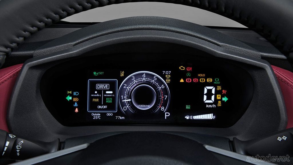 The new Yaris Ativ sports a rather serious face for its size and tries to look like one of its larger siblings, such as the Camry. But the rear-three-quarter angles are more appealing, in my personal opinion. 16-inch alloy wheels come standard. As for exterior colors, there are 7 options: Spicy Scarlet, Urban Metal, Super White, Metal Stream, Red Mica Metallic, Attitude Black Mica and Platinum White Pearl. The last color costs THB 7,000 extra, and I’ve no clue what some of the other colors are.