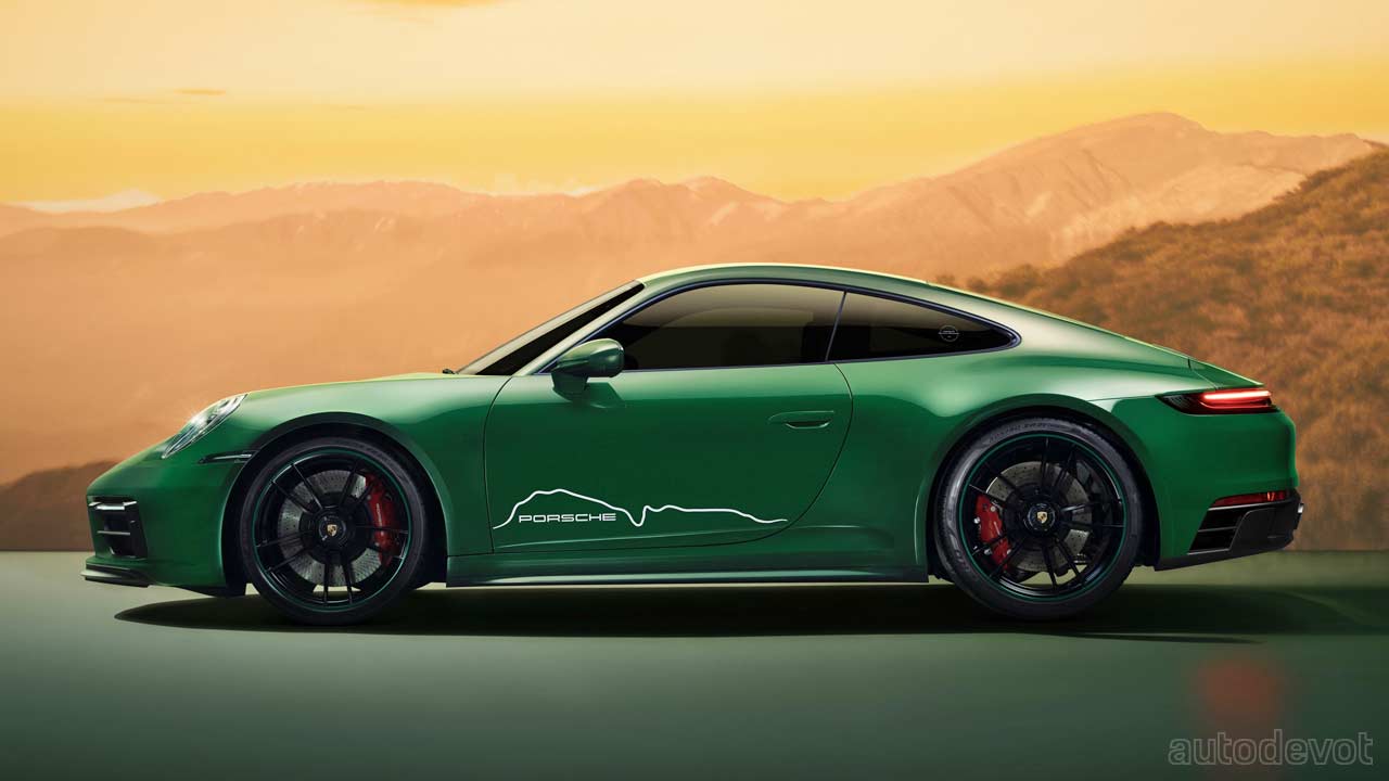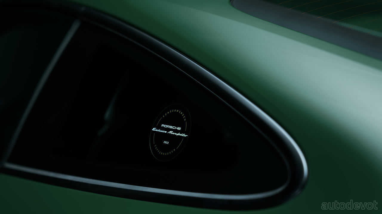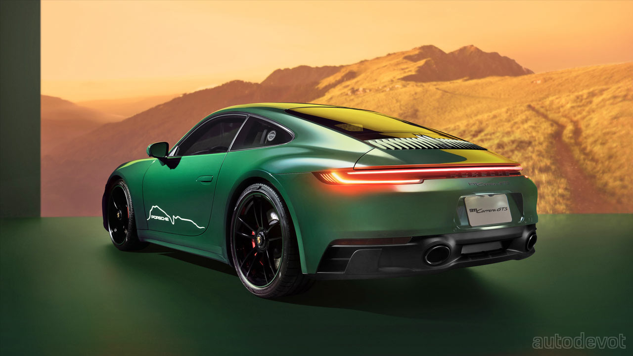 The lower part of the doors features a silhouette of the Taiwanese coastline in matt white. Also, the Turbo S Exclusive Design wheels are painted in black with a pinstripe on the edge in Irish Green, and the badge underneath the taillight strip is in matt black.