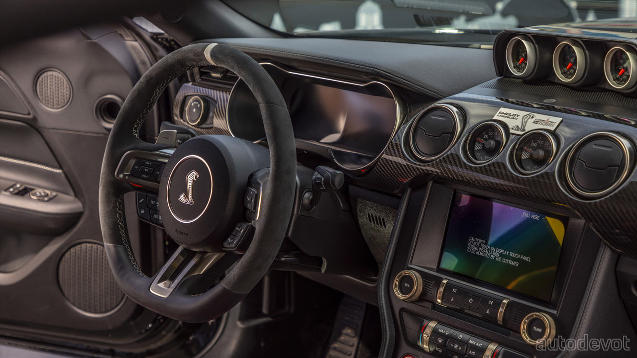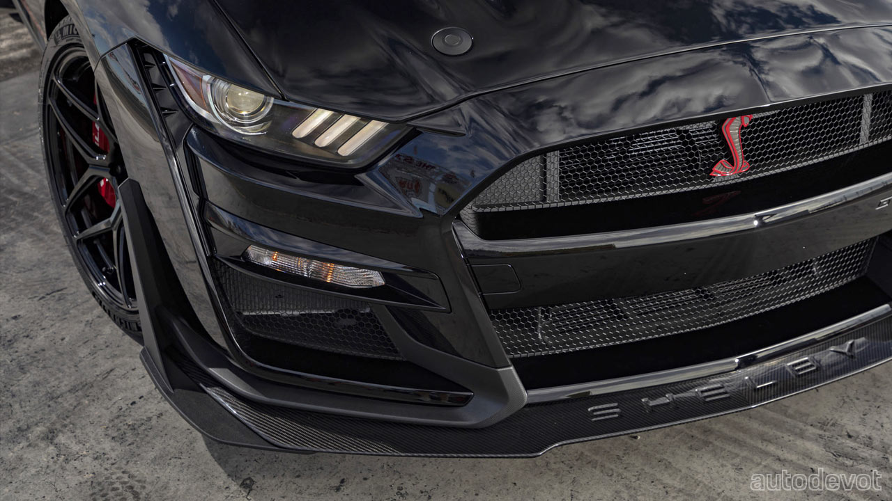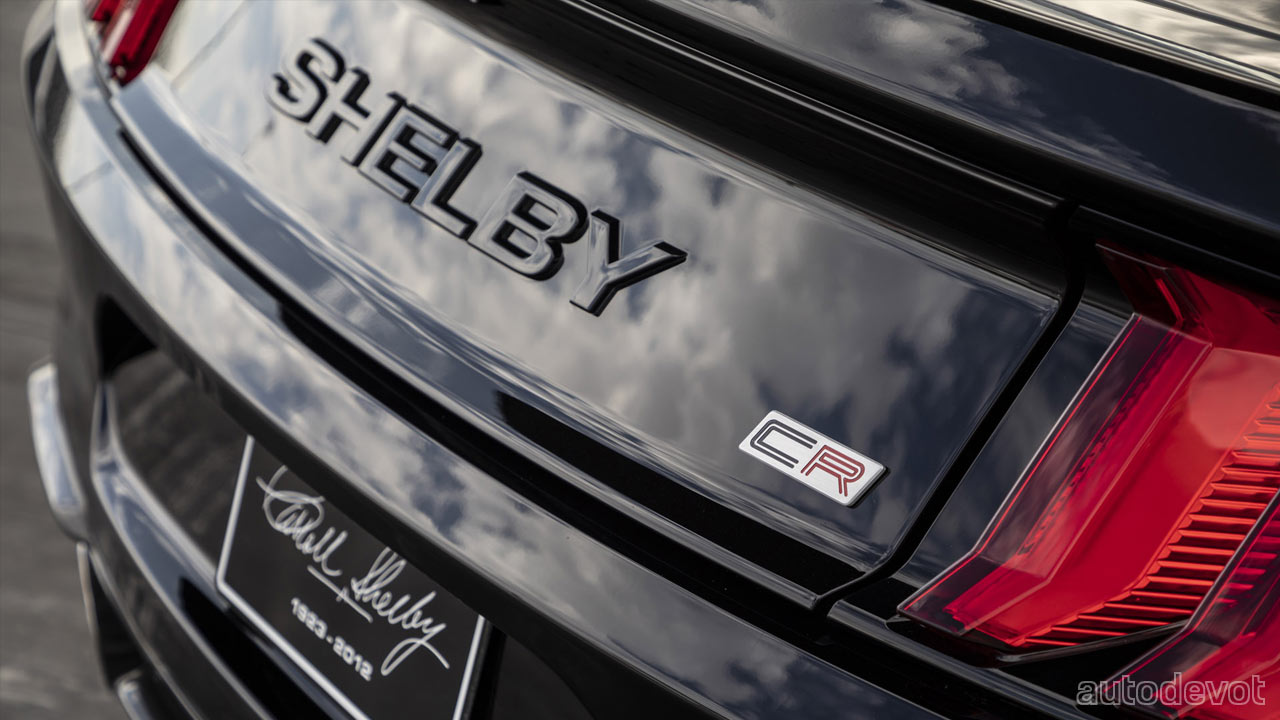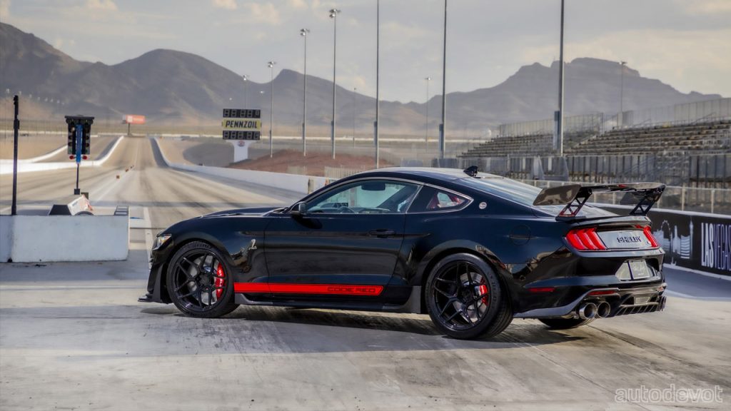 So, what’s this package all about? Well, on the exterior, you get a carbon fibre hood, a carbon fibre front splitter, Shelby rocker panels, carbon fibre rocker wings, Shelby rocker stripes, a carbon fibre rear wing, carbon fibre rear diffuser, 60th anniversary badging (MY 2022 only), Code Red badging, and 20-inch forged aluminium wheels. In terms of performance, you get ride-height adjustable front and rear springs; Ford Performance front and rear sway bars; MagneRide suspension recalibration, and caster camber plates.