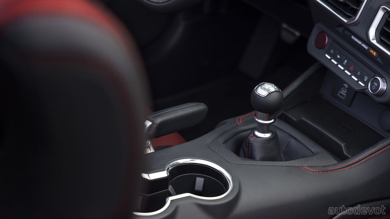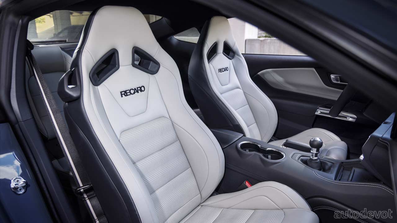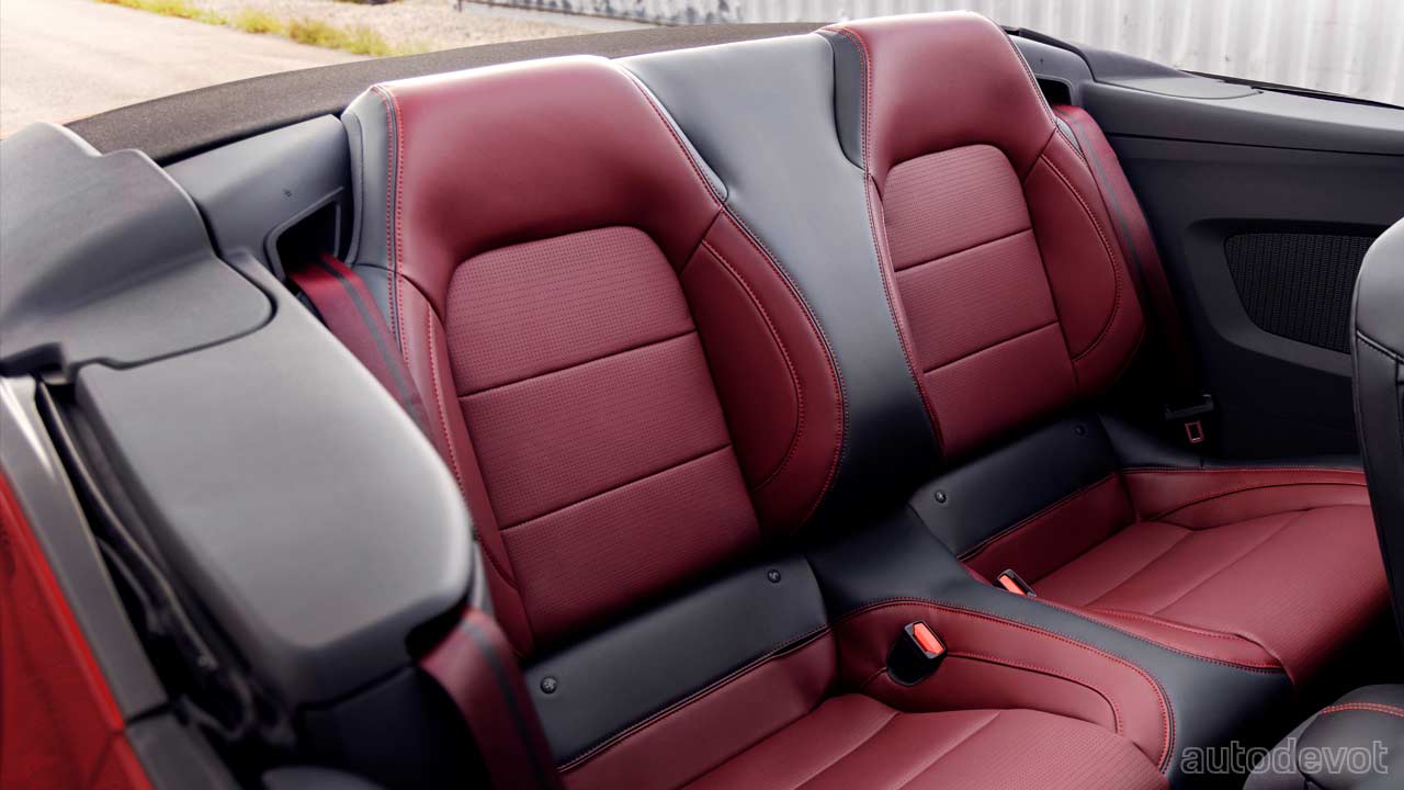Ford claims the cockpit of the 7th-gen Mustang to be the most technologically advanced, driver-centric cockpit of any Mustang to-date. The dashboard houses a curved panel that integrates a 12.4-inch digital instrument cluster and an optional 13.2-inch SYNC 4 touchscreen. The base models are probably gonna get a smaller touchscreen. But another highlight is that the digital instrument cluster can be customized to display different animations and drive-mode-based visuals—powered by the Unreal Engine 3D creation tool used in modern video games and movie/commercial production.