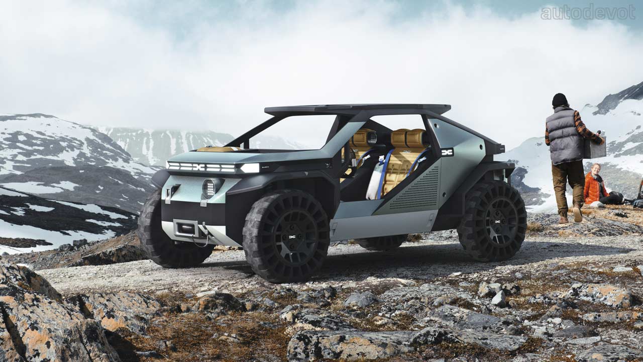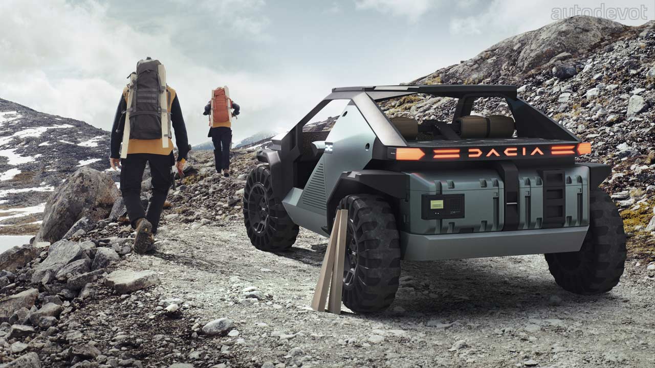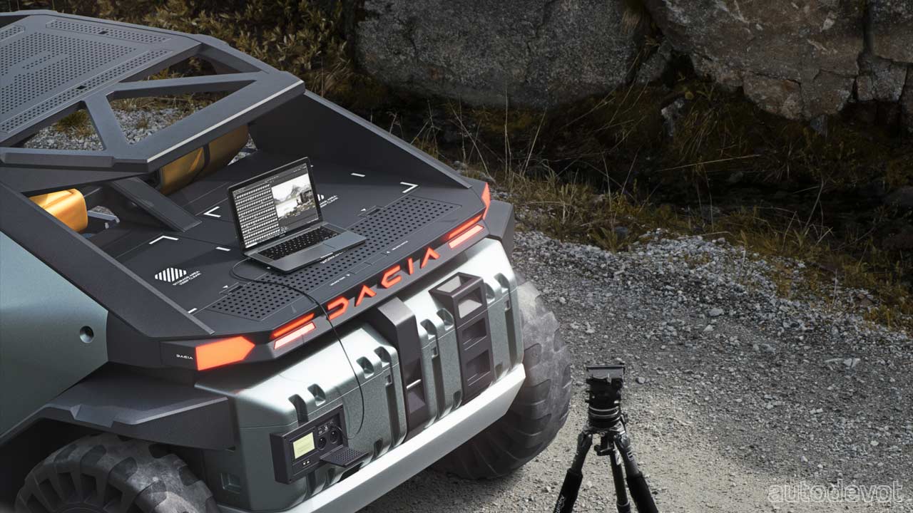 Also, Dacia says that the plastic body parts contain a significant portion of recycled material called Starkle, made from processed polypropylene. The roof comes with flush-fit barricades that can be opened up to carry and secure stuff. Is that a battery pack at the rear? Well, yes, and it can be removed should you need to use it to power something when you’re out on an adventure. Another key highlight on the exterior is the concept’s puncture-proof airless tyres.