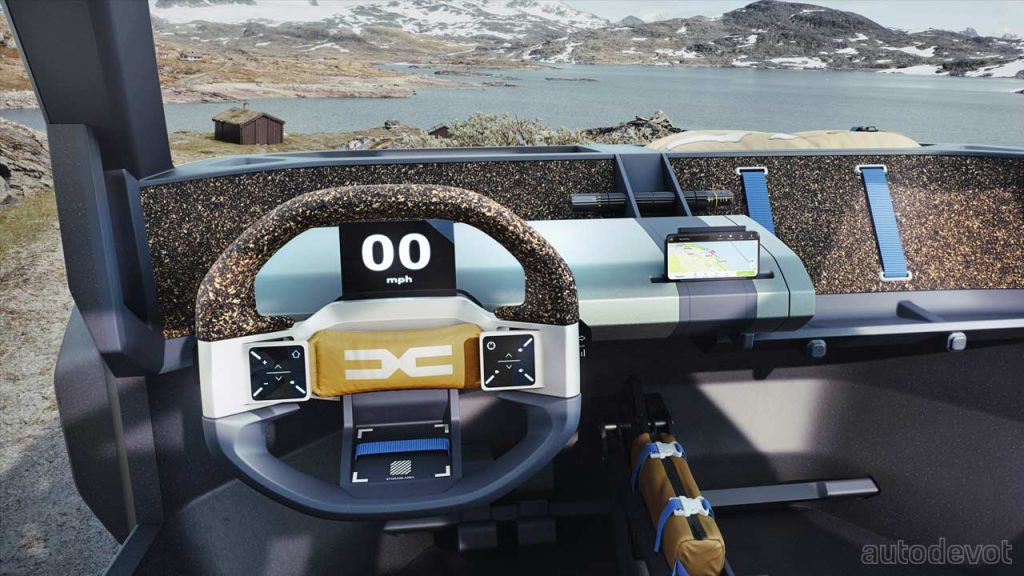 On the inside too, sustainability is the order of the day. The dashboard, for instance, is covered with cork; the same is used on the steering wheel’s upper part as well. The seat covers are removable so that you can make them into sleeping bags. Dacia says that the Manifesto concept is waterproof on the inside as well, and you can apparently clean with a water jet. But just make sure to take your smartphone off the dashboard, coz you know, better to be safe than sorry.