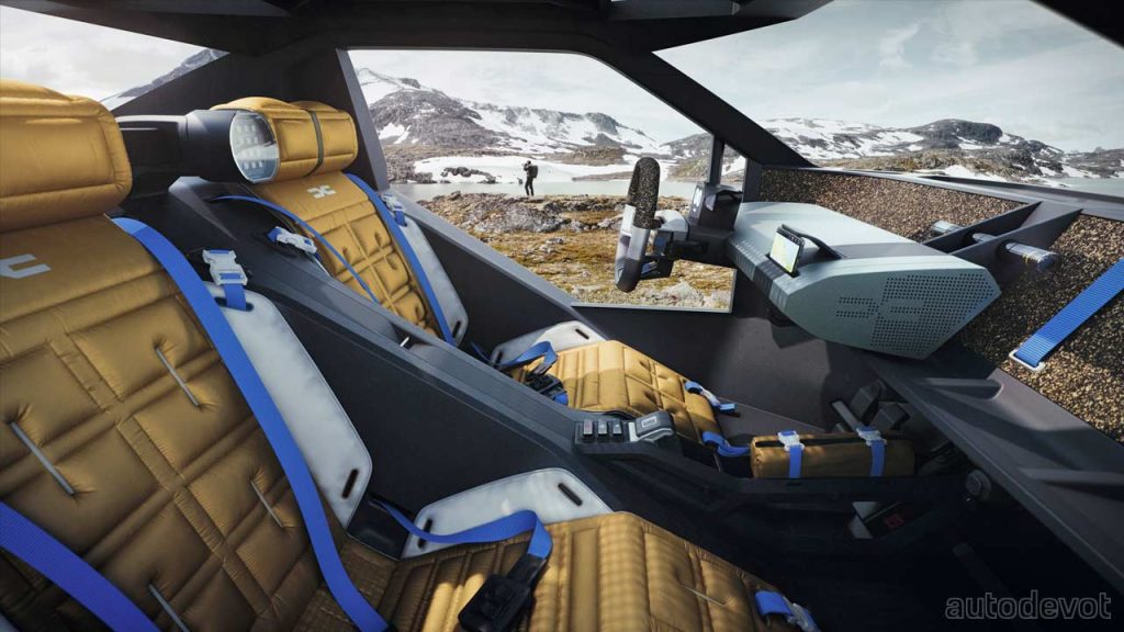 So, what exactly are we looking at here? Well, the concept has got no doors, no windows, not even a windshield.. and you know what? There’s no touchscreen infotainment either, but that’s okay, you can Bring-Your-Own-Device that could be integrated into the vehicle’s onboard computer. But anyway, the upper lights you see on the front fascia are just running lights, and there’s only one headlight (on the left side) underneath that strip of lights, because why use two if one can offer all you need? And apparently, the headlight can be detached to be used as a powerful torchlight.