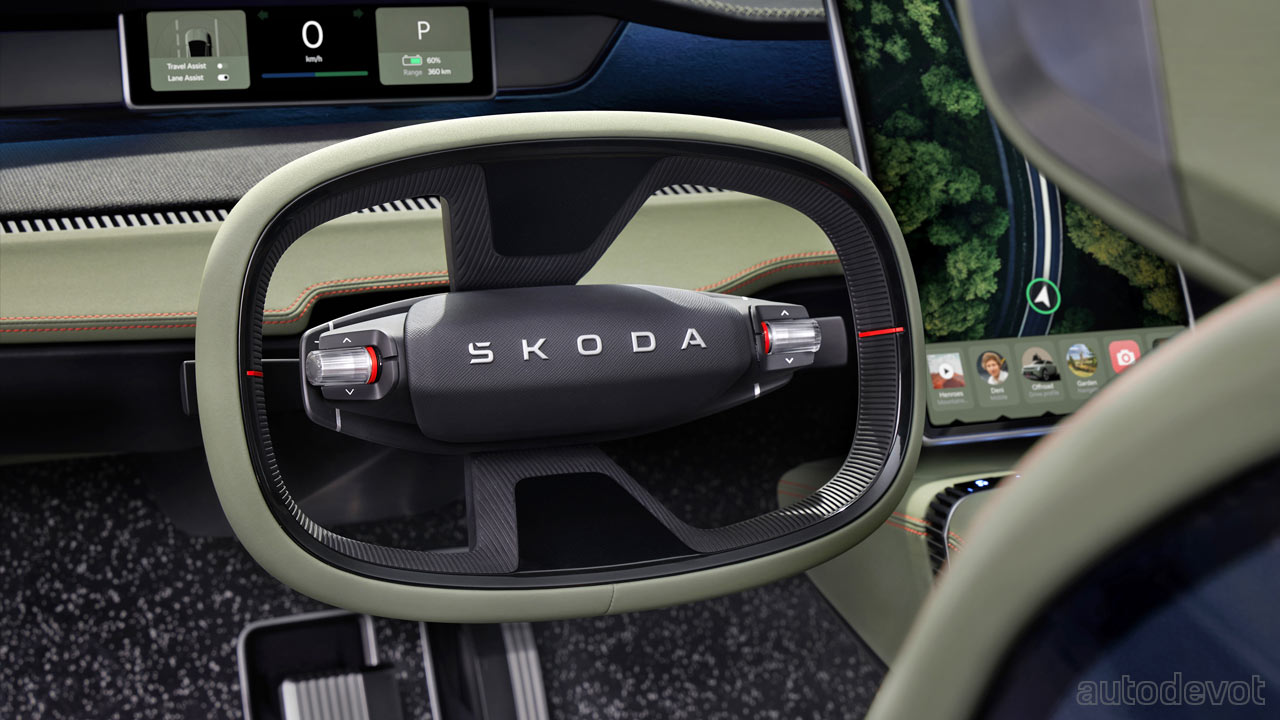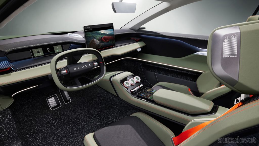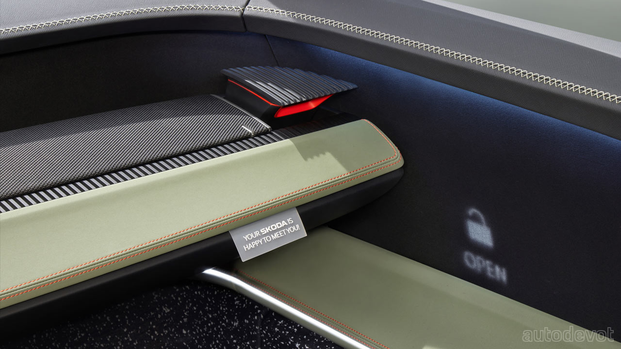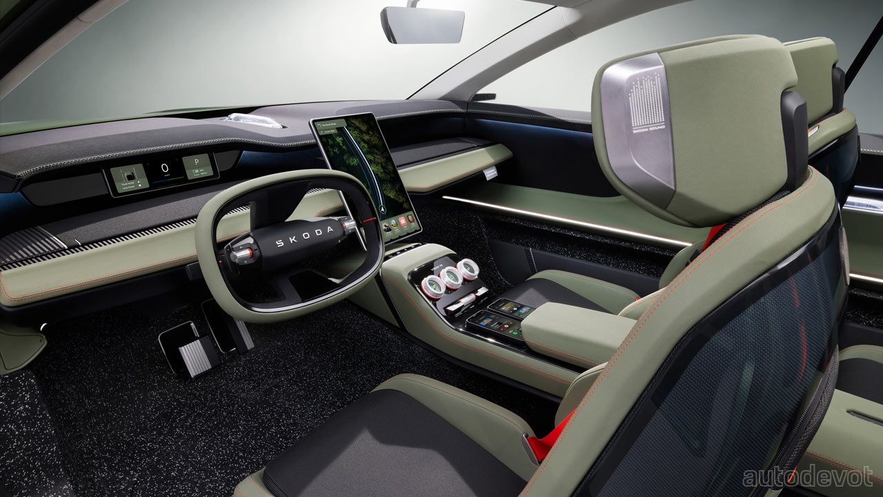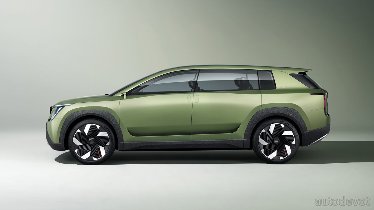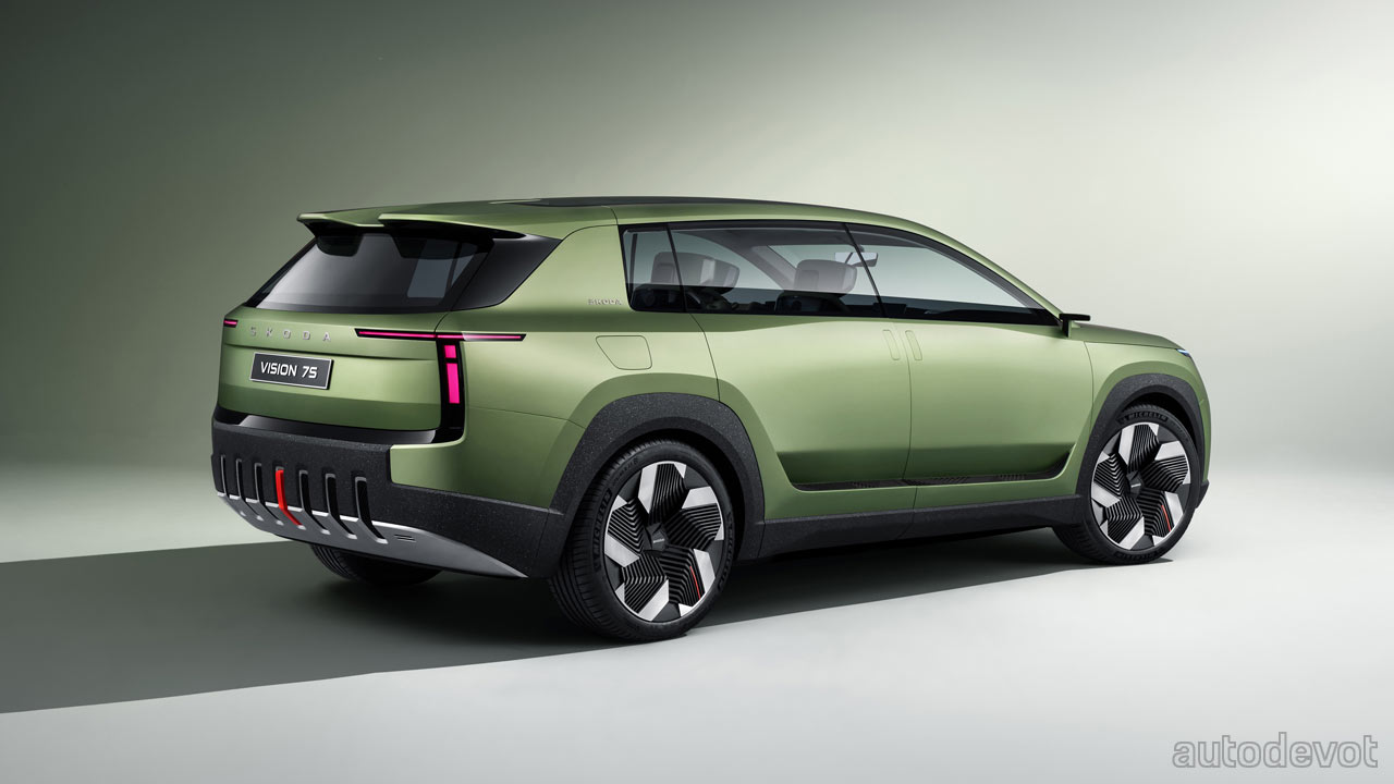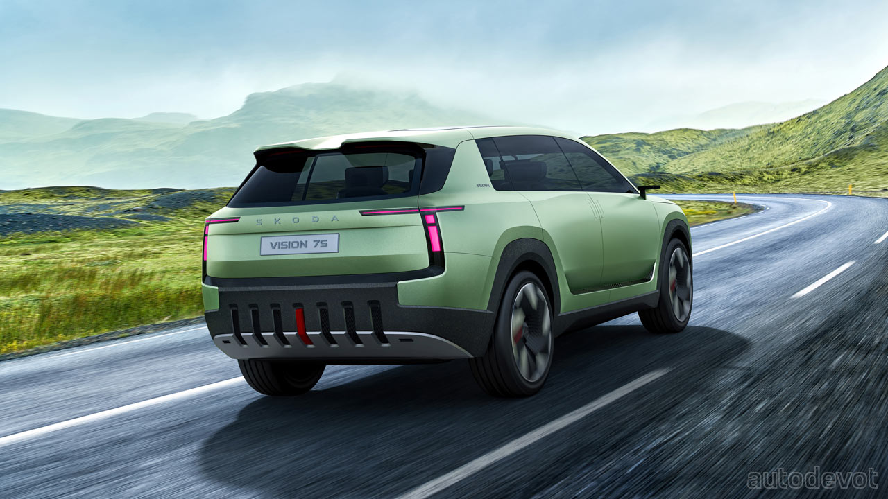 Speaking of the rear, the integrated roof spoiler comes with finlets that create a valley in the middle for better airflow. On the side, notice that the flush door handles are also vertical. And just above the side skirts, there are air outlets to extract hot air from the battery pack. Another highlight of the Vision 7S is that it is the first Skoda to be painted in a matt finish with a color called Explorer Green. The rather large 22-inch rims are fully covered for aerodynamic reasons.
