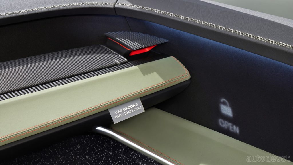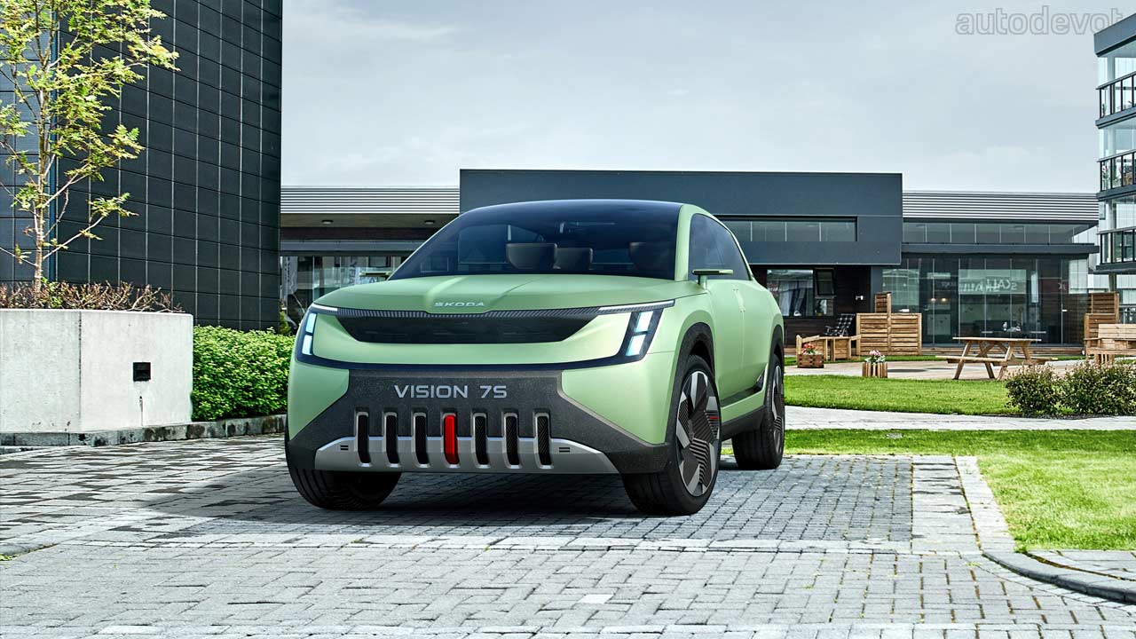 According to Skoda, the Vision 7S concept is actually a preview of the brand’s new design language that’s gonna be introduced with the upcoming new electric vehicles. But of course, the production 7S is gonna be the first one to sport this new design language plus new Skoda branding (new Logo). Skoda calls the front fascia ‘Tech-Deck Face’, which apparently is a modern interpretation of the traditional Skoda radiator grille. The new grille is flatter and wider, with its ribs replaced by dark glass that covers the car’s sensors.