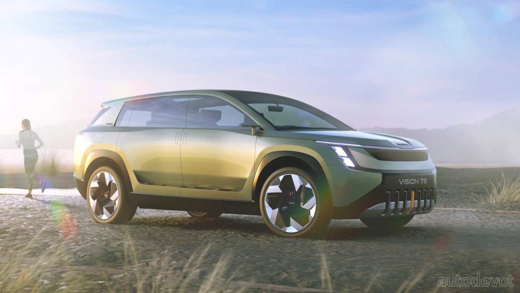 By 2030, Skoda aims to achieve a share of over 70% of all-electric car sales in Europe, and as part of those plans, three new all-electric models will join the Skoda portfolio by 2026. And one of those is gonna be a 7-seater family crossover based on the Vision 7S concept we’re seeing here.