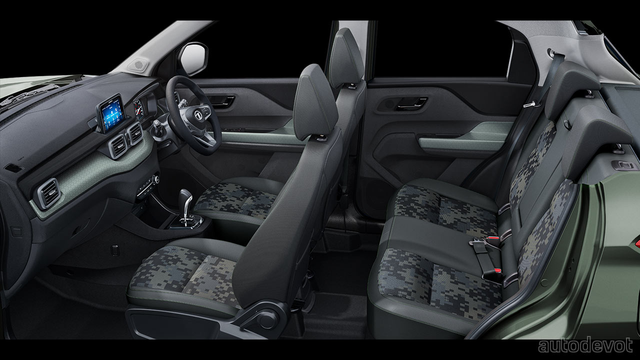 Inside, the dashboard and the door panels feature Military Green contrast accents with a tri-arrow pattern, while the seats feature a fabric upholstery with Camo inserts. Other key features depending on the variant include a 7-inch touchscreen, Android Auto & Apple CarPlay connectivity, 4 speakers, cruise control, and height-adjustable driver seat.