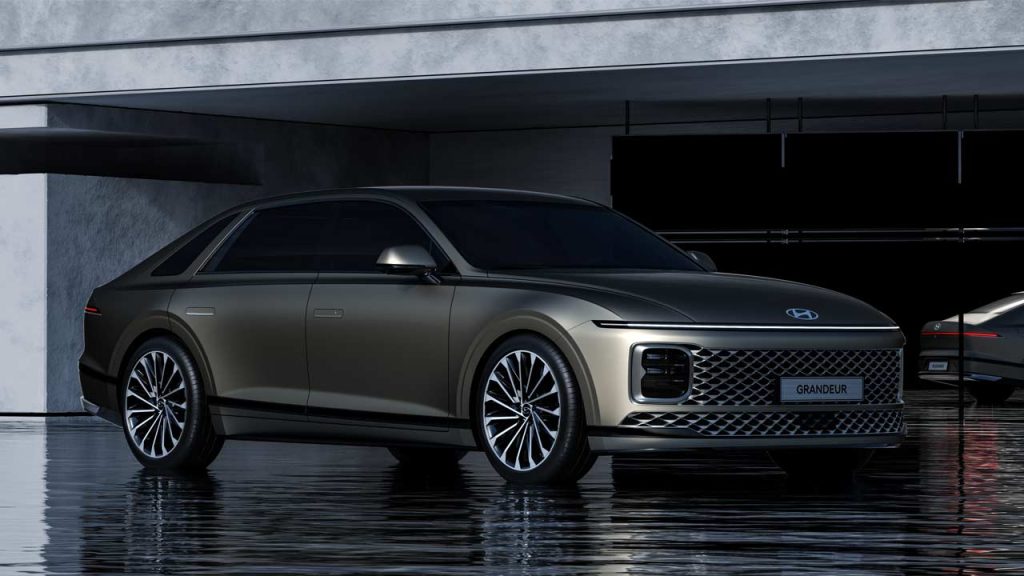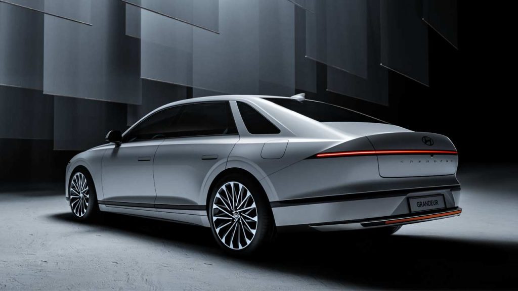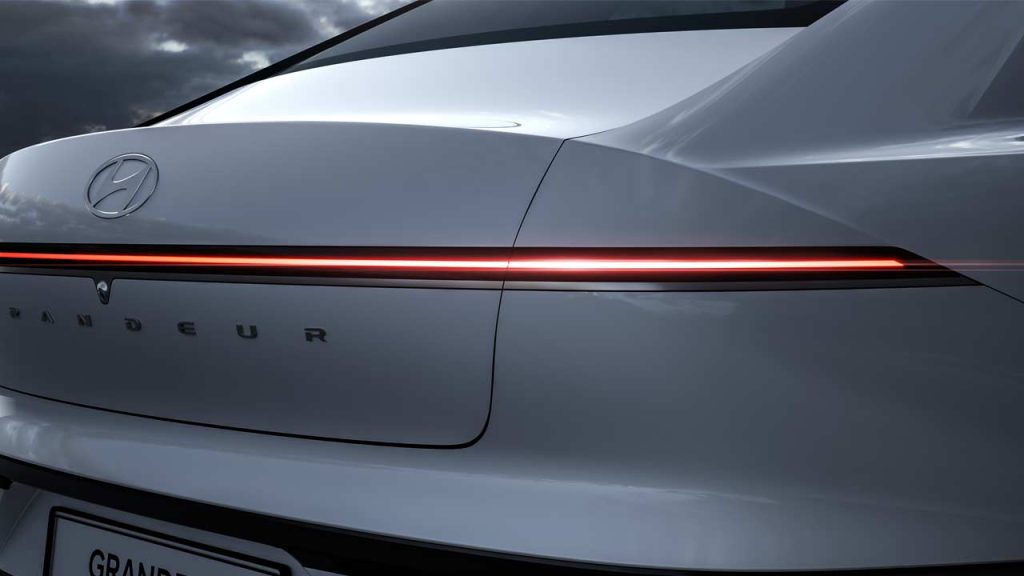 Speaking of which, the 2023 Grandeur is indeed a grand-looking executive saloon, in which, the executives in the back seat will indeed feel like they’re worth millions of dollars regardless of their actual net worth. The ‘Seamless Horizon’ design language is kind of a complete departure from the outgoing Grandeur’s design. The front fascia is dominated by a full-width lightbar at the top and an equally wide honeycomb-mesh grille at the bottom. The grille is split into two parts where the upper one houses headlight units at the edges. At the rear, you just have a full-width lightbar and what appears to be a reflector strip at the lower part of the bumper. Flush door handles, multi-spoke two-tone wheels and darkened B-pillars add to the Grandeur’s grand side profile.