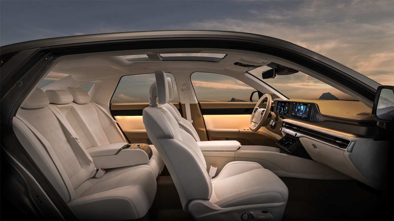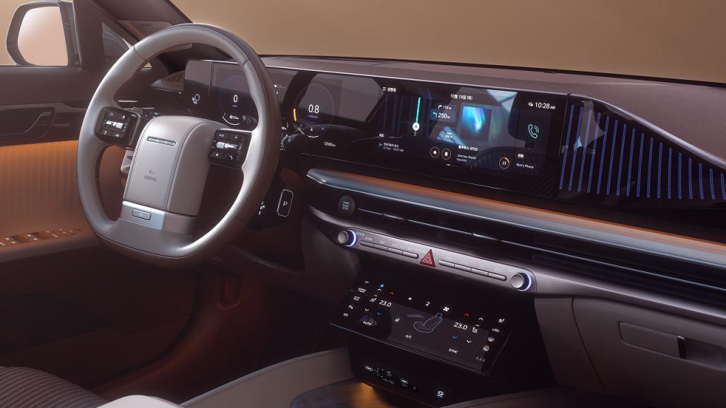 On the inside, things look just as grand, or, “Grandeur”, if you swing that way. The dashboard is dominated by a rather large “floating” panel that houses a digital driver display and a touchscreen. But what I do appreciate is that the designers have kept some physical controls—underneath the air vents. Underneath that, you’ll find another touchscreen for climate and seat settings. The flat-bottom steering wheel looks pretty chic too, and the gear selection knob has been moved to the steering column in order to free up more space in the centre console. Indeed, the seats look pretty luxurious as well. Materials used inside include real wood, aluminum and naturally dyed Napa leather. The seats feature quilting in a traditional Korean pattern. The pattern on the door panels is also designed with Korean aesthetics.