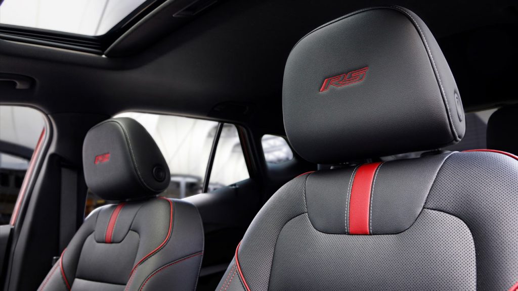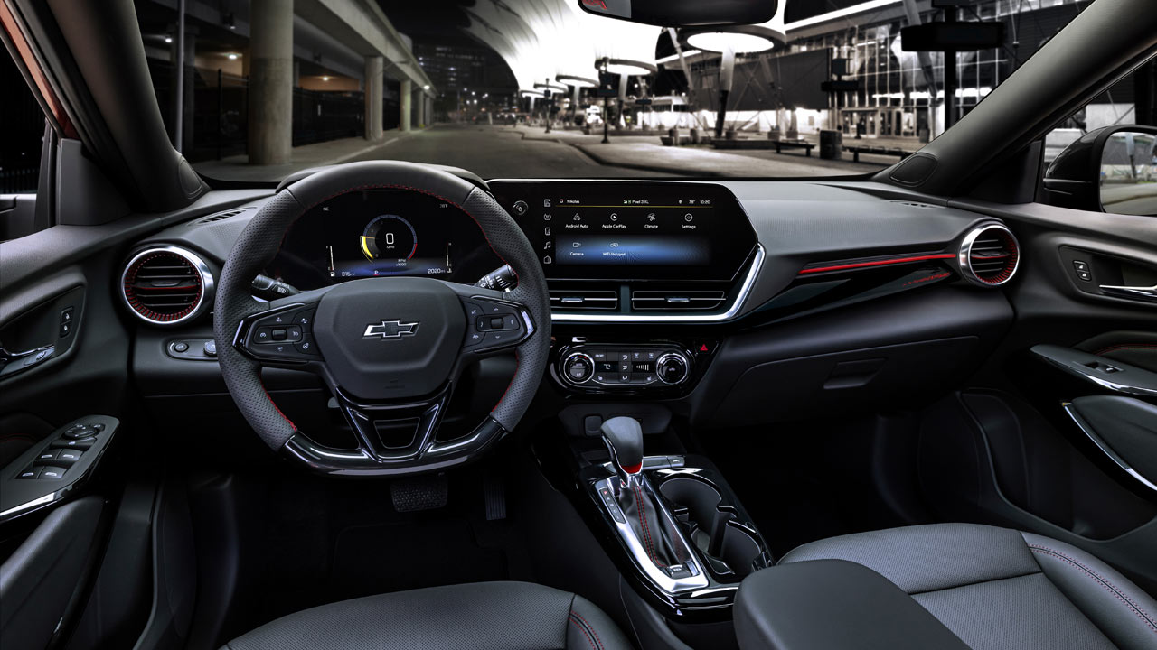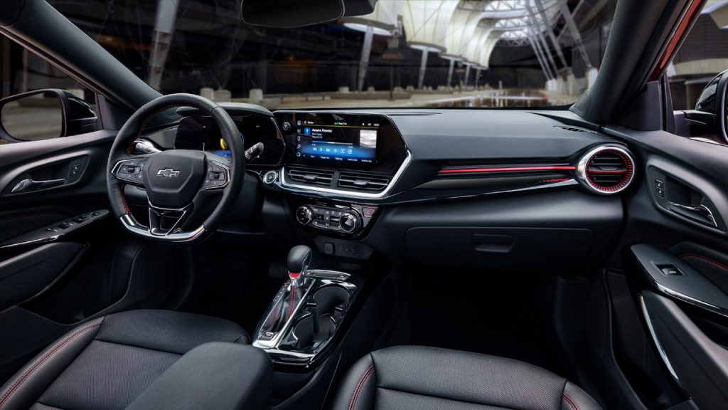 The 2RS features a sporty dark theme with red accents, plus a flat-bottom steering wheel. But anyway, the standard Chevy Safety Assist suite of ADAS include Automatic Emergency Braking, Front Pedestrian Braking, Lane Keep Assist with Lane Departure Warning, Forward Collision Alert, IntelliBeam auto high-beam control, and Following Distance Indicator. The Rear Vision Camera is standard as well. However, Adaptive Cruise Control, Lane Change Alert with Side Blind Zone Alert, Rear Cross Traffic Alert, and Rear Park Assist, are all optional extras.