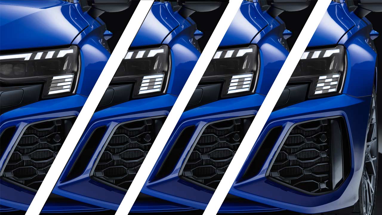 When you unlock the RS 3 performance edition, the 15-LED DRLs display the “checkered flag” on the passenger side and the “3‑0-0” on the driver side—alluding to the limited number of units and a top speed of 300 km/h. Upon locking, the “R-S-3” lettering appears instead of “3‑0-0”.