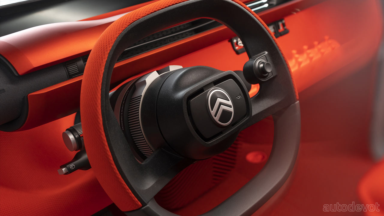 Notice that the door panels are, well, pretty much naked. Removing speakers, soundproofing material and electrical wiring save ~7 kg (15.4 lbs) per door, says Citroen. Instead of a full dashboard with multiple screens and hidden computers, the oli features a single symmetrical beam running across the width of the vehicle from which hangs the steering column and wheel on one side, a smartphone dock, and five clearly labelled toggle switches for the air conditioning system in the centre. Citroen proudly shares that the oli uses just 34 parts in this space while a comparable compact family hatchback uses around 75 parts in its dashboard and centre console.