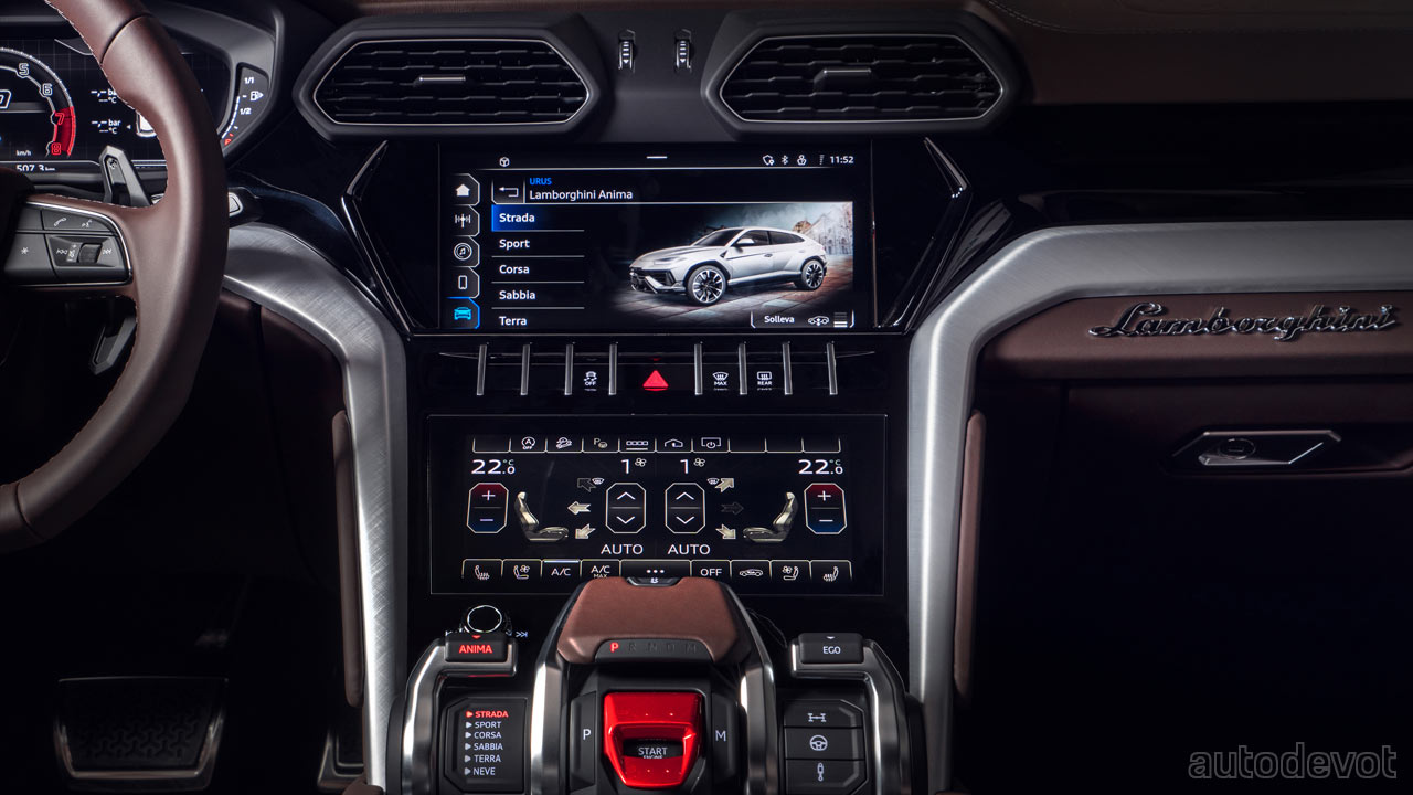 But anyway, as mentioned, the 4.0L V8 biturbo offers the same numbers as the Performante: 490 kW (666 metric hp) and 850 Nm (627 lb-ft). The official 0-100 km/h (62 mph) sprint time is 3.5 seconds while the top speed is 305 km/h (189.5 mph). The slight variation in performance figures is mostly due to the fact that the Urus S weighs 47 kg (104 lbs) more than the Performante (2,197 kg vs 2,150 kg). As for drive modes, you got Strada, Sport, Corsa, Sabbia, Terra, Neve, and of course, the Ego mode. Sabbia, Terra and Neve are for off-roading.
