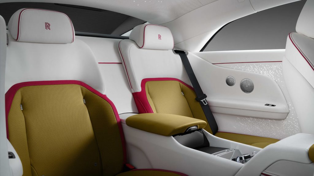 Another highlight of the Spectre is that for the first time on a series production Rolls-Royce, the Spectre is available with Starlight Doors, incorporating 4,796 softly illuminated “stars”. The coach doors can also be commissioned with a backdrop of Canadel wood panelling, which takes its name from the cove in the South of France where Sir Henry Royce and his design team apparently spent their winters. The new front seat design has been inspired by British tailoring, with lapel sections that can be bespoked in contrasting or matching colours to the main base.