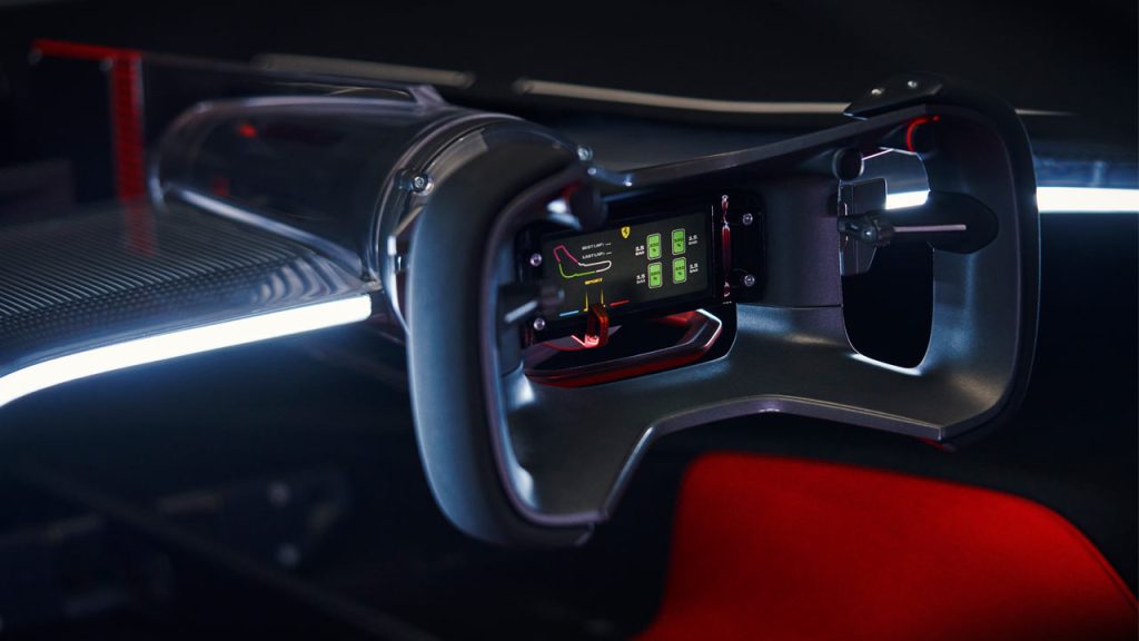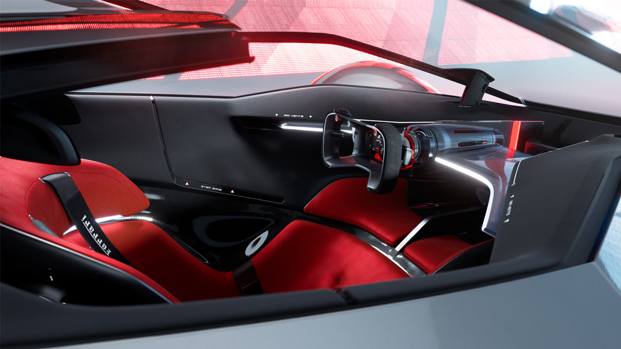 It’s a single-seat racer with a canopy access, of course. On paper, the Ferrari Vision Gran Turismo is powered by a modified version of the hybrid powertrain found in the 296 GTB, 296 GTS, 296 GT3 and also the new 499P. Since there are no technical regulations to comply with here, the ICE is tuned to deliver 757 kW (1,030 metric hp) at 9,000 rpm and 900 Nm (664 lb-ft) at 5,500 rpm. An additional 240 kW (326 metric hp) will be available from three electric motors—one on the rear axle and one on each of the front wheels. Transmission is gonna be an F1-grade 8-speed DCT automatic. Dry weight on paper is 1,250 kg (2,756 lbs).