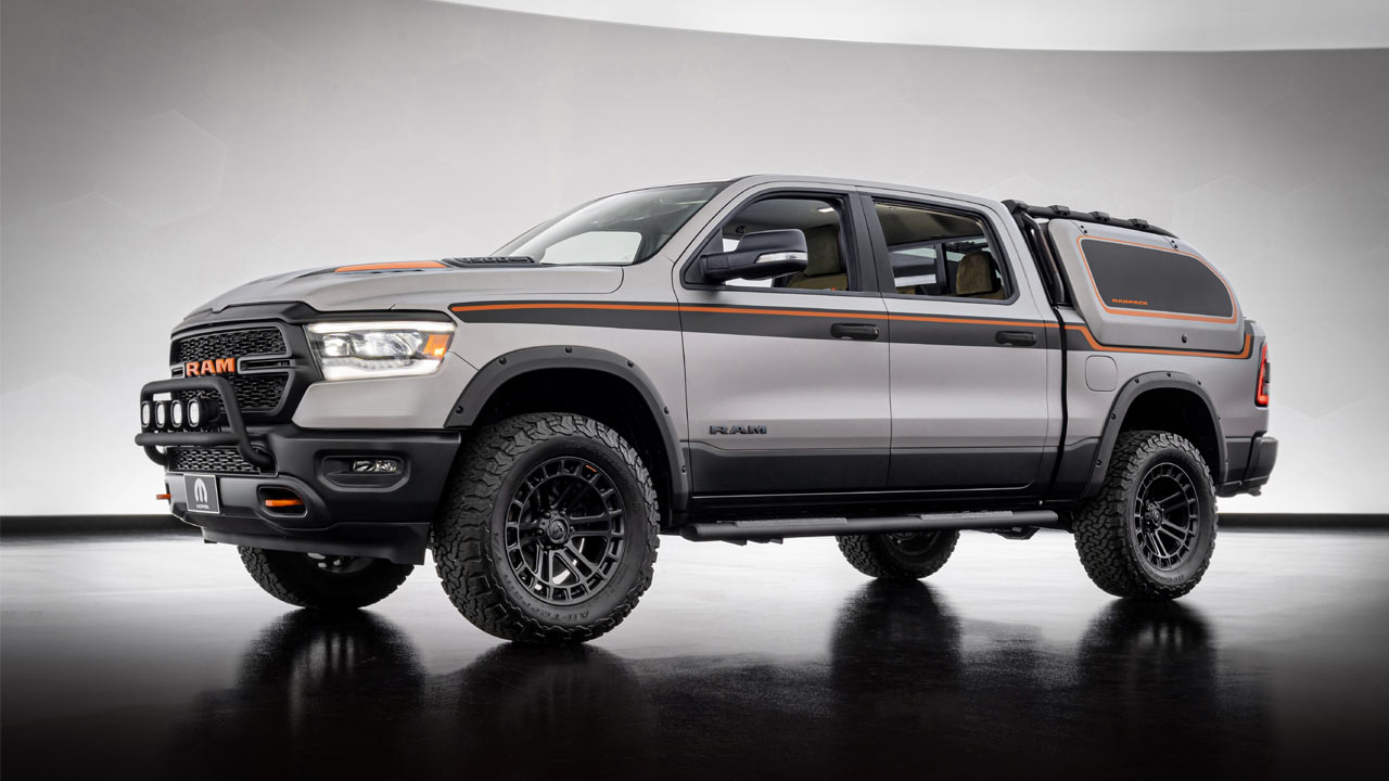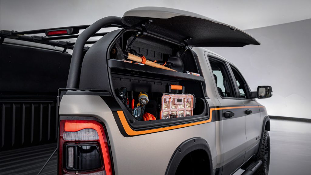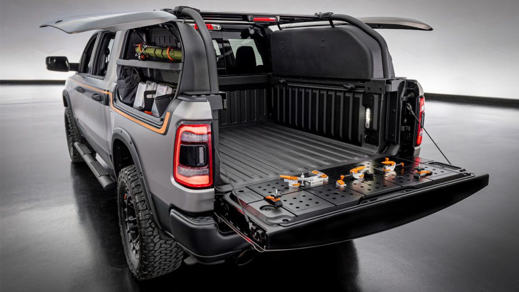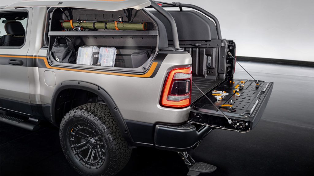 The concept integrates conceptual RamPack storage compartments on both sides of the truck bed, showcasing that you can significantly increase the storage space without compromising the functionality of the pickup bed itself. The storage compartments are covered by a carbon fibre hatch-type panel. Inside, Mopar RamBox vertical bin dividers help organize your things. Also fitted to the concept is a RamRack—which uses additional Thule cross rails if you need to carry more stuff. Attached at each corner of the RamRack are 2-inch TYRI LED lights, while a Center High Mount Stop Light adds a third brake light to the rear crossbar.