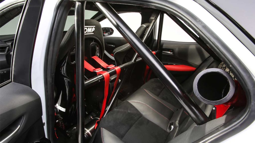 The team kept the GR Corolla’s stock brake setup with 14 x 1.1-inch ventilated rotors with four-piston aluminum calipers, then added Wilwood turning brakes—a secondary set of rear calipers—to help provide the braking and turning control needed for gravelly terrain. Combined with the custom bodywork, the result is a stance that is 6-inches wider than stock.