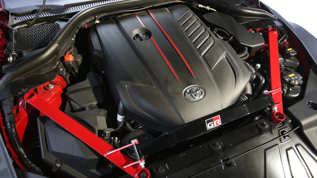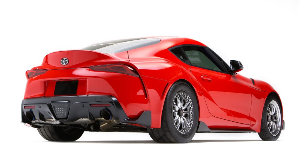 Toyota said that the Toyota Motorsports Garage team was given a $10,000 build budget, which I think is a pretty good build budget for a 5-day show. The team—Marty Schwerter, lead builder; Brad Vetter, lead fabricator; Justin Lacore, fabricator; and David Senn, technician, started off with two model year 2020 GR Supra 3.0 with a plan to increase horsepower by 30 to 40%. They added a Pure Turbo single turbo and two CSF high-performance intercoolers, then worked closely with one of the leaders in the import drag racing world, Titan Motorsports, adding a catless downpipe, 3.5-inch exhaust and an ECU tune.