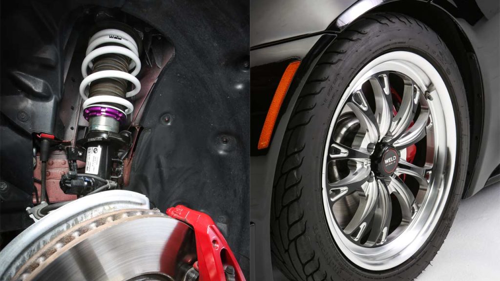 As for brakes, the stock 13.7-inch front discs with four-piston Brembo calipers and 13.0-inch rear discs with single-piston floating calipers were retained, but the team added Hawk Performance pads for a more braking bite.
