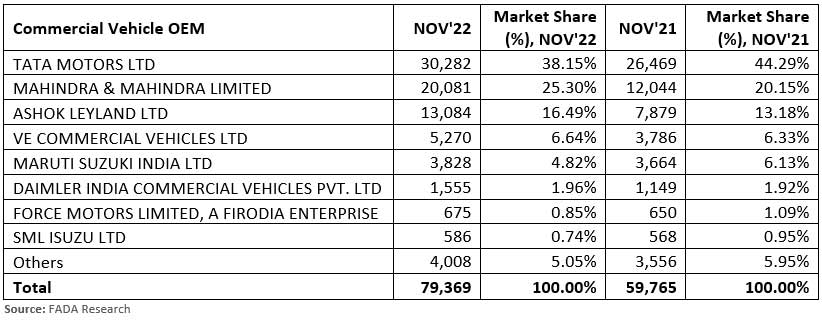 The Federation of Automobile Dealers Associations (FADA) has published November 2022 vehicle retail data, which shows an overall growth of nearly 26% compared with November 2021 data. The Passenger Vehicle segment retailed a total of 3,00,922 units last month as opposed to 2,48,052 units during the same period last year, registering a growth of just over 21.3%. In the PV segment, Tata Motors and Mahindra continue to hold their 3rd and 4th place, respectively. Mahindra dealers retailed over 9,300 PVs more than Kia, keeping the latter in 5th place.