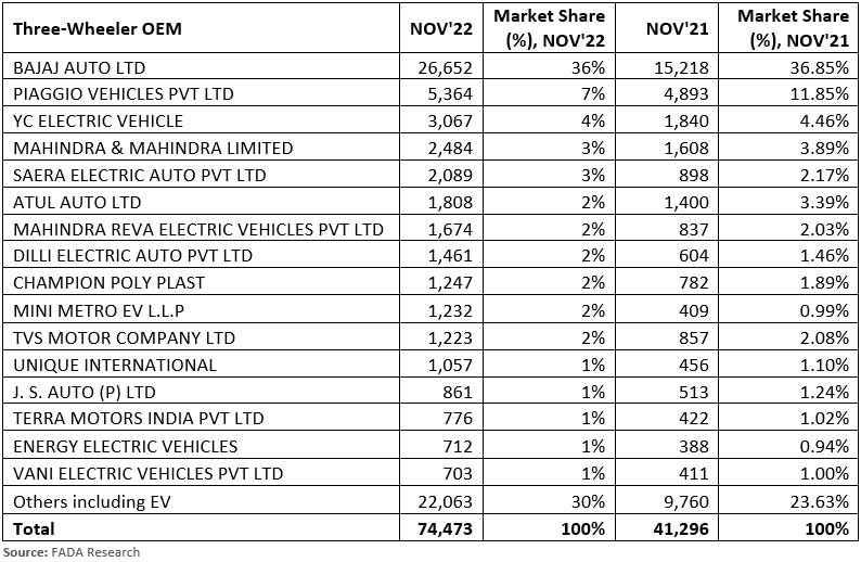 The 3W segment showed a massive growth of 80% YoY and 4% when compared to 2019, a pre-covid year. The category which was witnessing low demand during covid has now emerged as the highest-growing category. Also, electrification in the category continues at its highest pace.
