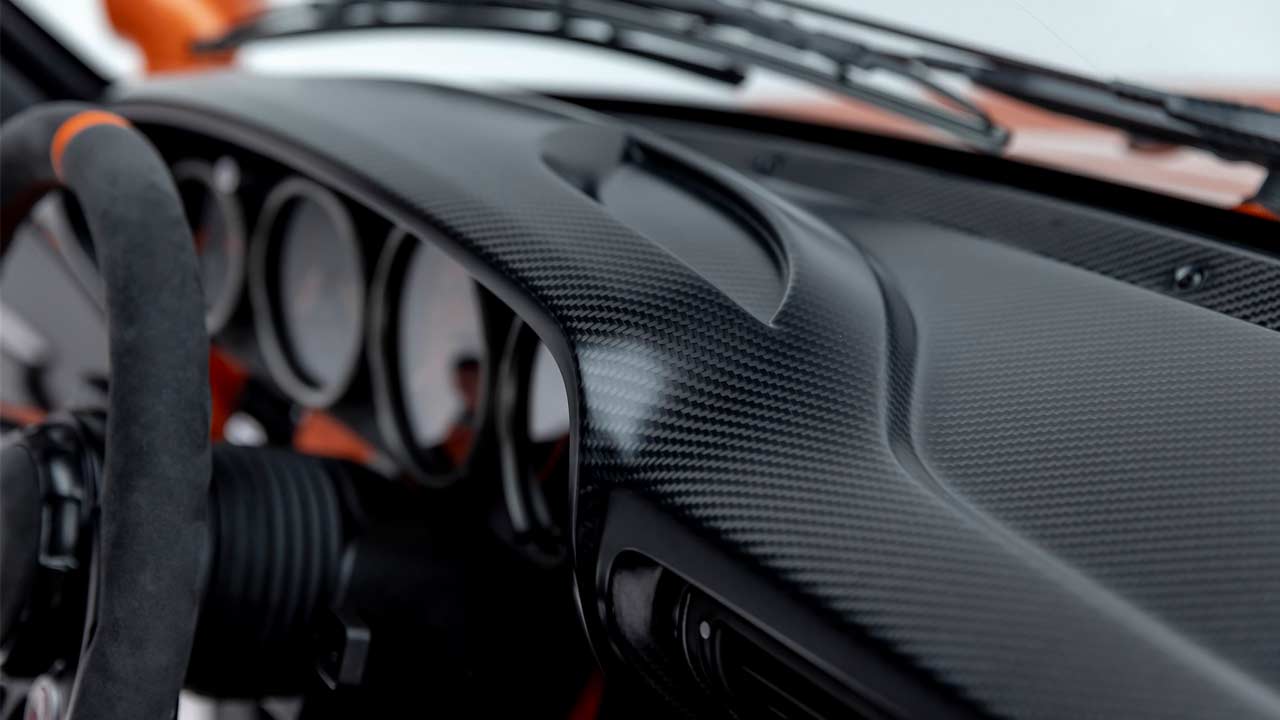 On the inside too, there’s a generous application of carbon fibre, of course. Wherever you lay your eyes, you see carbon fibre goodness, and as you also probably see, Alcantara has been given equal prominence. CNC-machined billet door handles; CNC-machined billet ignition cover; billet aluminum ignition key; forged aluminum pedals, and a Porsche Classic Radio are some of the other key highlights. The re-worked instrument cluster features rev counted re-calibrated to 9,000 rpm (the engine revs to 7,500 rpm though).