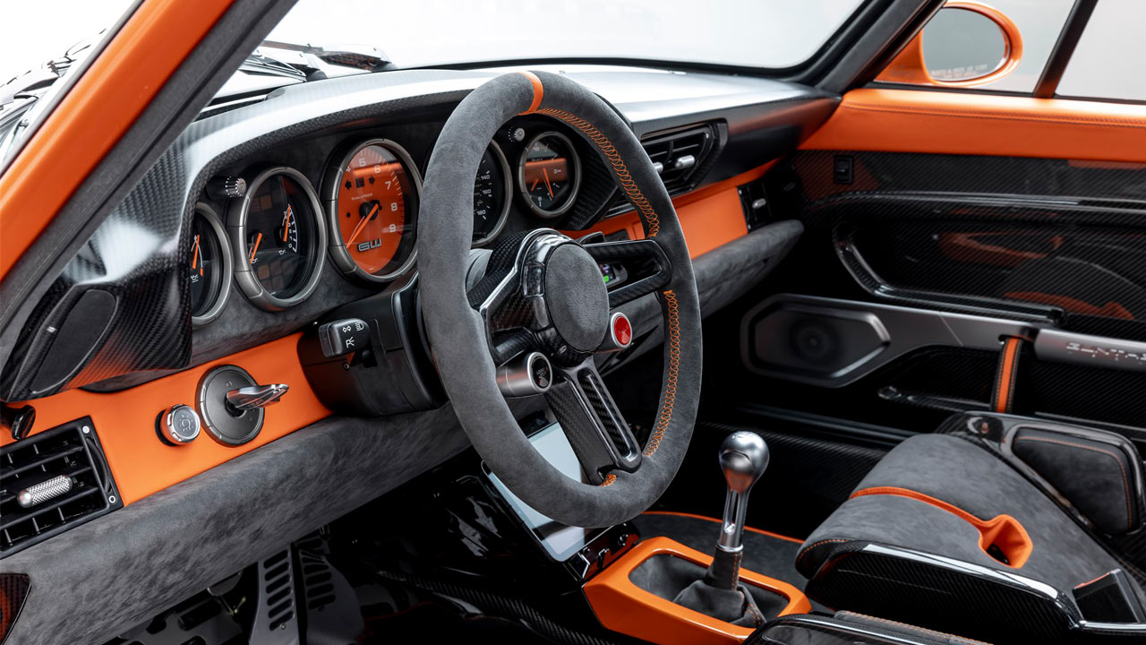 The classic Turbo coupe is remastered with carbon fibre body panels—which together are said to save over 227 kg (500 lbs) from the donor car. The new body panels offer revised aerodynamics, such as the vented hood and widened front fenders with vents to vent out turbulent air from the wheel wells. Notice that the rear fenders also have vents (or, inlets) to feed air to the engine bay.
