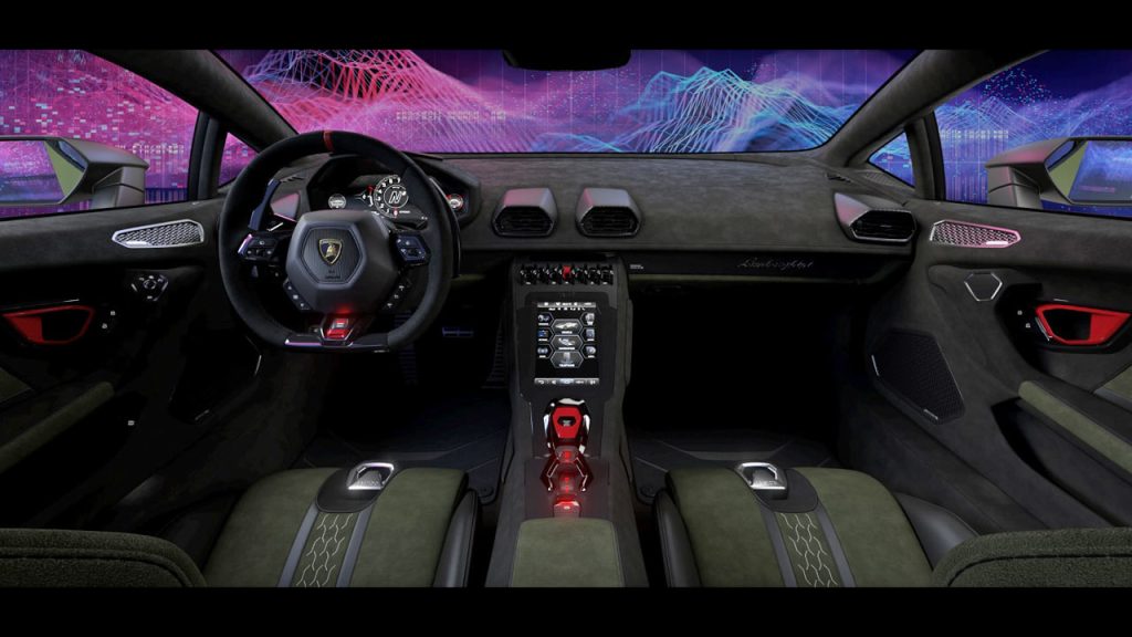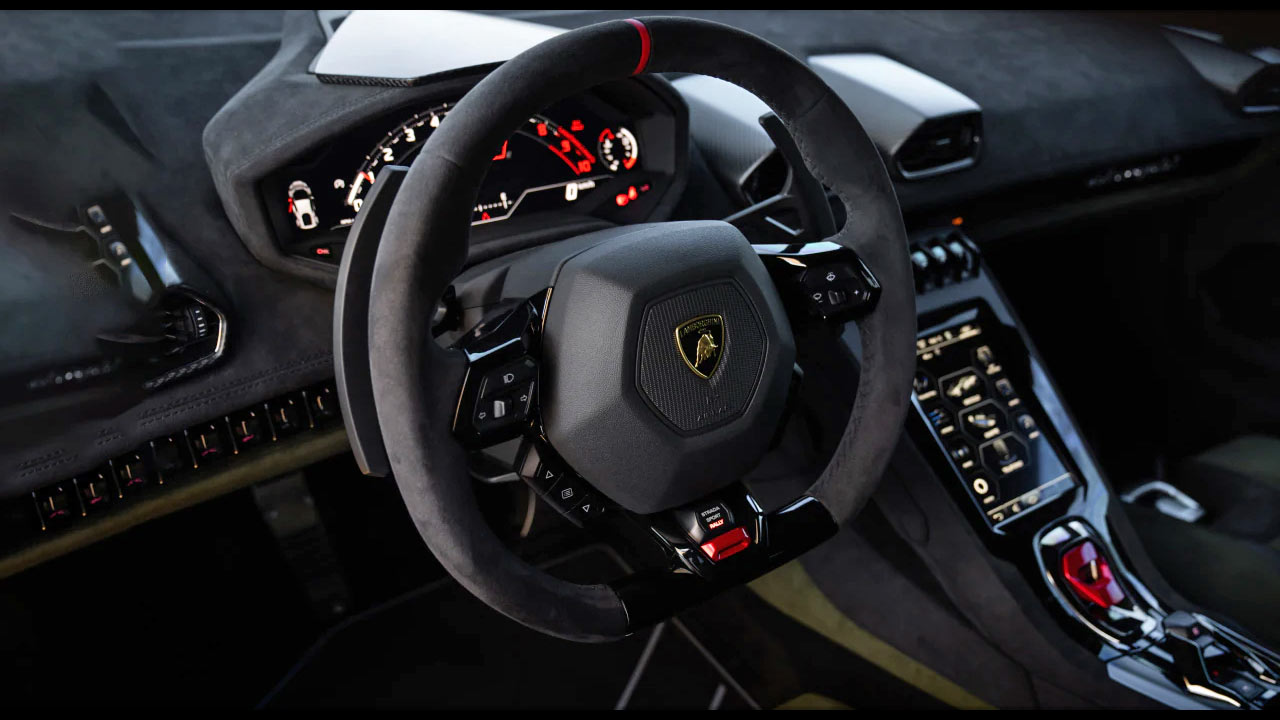 The cockpit features model-specific carbon bi-shell sports seats, four-point safety harness, and a titanium rear firewall. The ANIMA switch on the steering wheel features an extra RALLY mode, of course. Gotta have that mode, right? And of course, you’ll get all the creature comforts the regular Huracan carries.