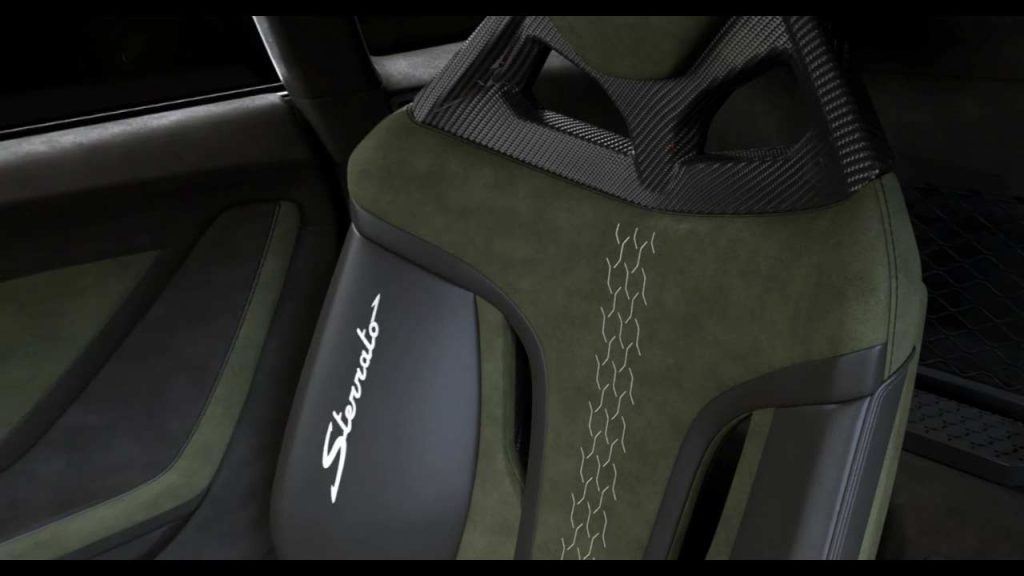 The Sterrato measures 4,525 mm long, 2,236 mm wide (including mirrors) and 1,248 mm tall, with a wheelbase of 2,620 mm. The 19-inch cast aluminum-alloy rims are wrapped with Bridgestone Dueler tyres of sizes 235/40 at the front and 285/40 at the rear. Braking duties are handled by ventilated and cross-drilled carbon-ceramic rotors measuring 380 mm at the front and 356 mm at the rear. The chassis is a hybrid of carbon fiber and aluminum, while the body panels are either aluminum or plastic.