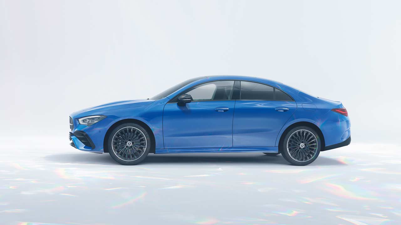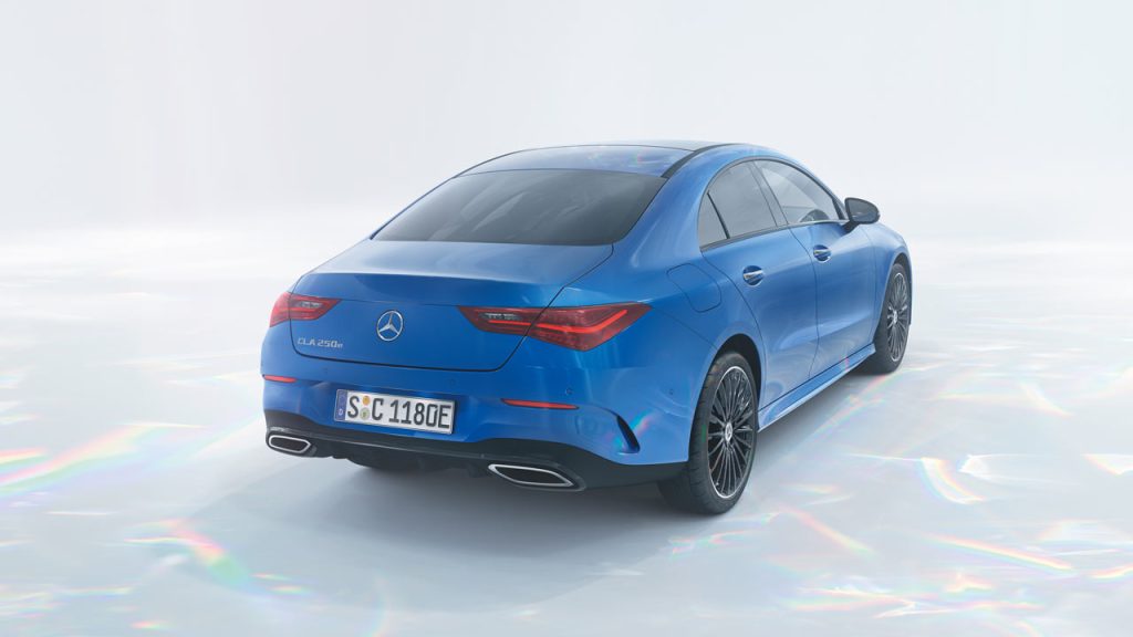 As you probably know, the CLA comes in saloon and estate/wagon bodystyles, and of course, in many flavors including a couple of ’em from AMG. Will talk about the flavors in just a minute or two, but visually, there’s a redesigned front bumper, a star pattern for the grille, and a redesigned rear diffuser. New LED headlights are standard this time around, and as you can also probably notice, the LED taillights have also got revised internals. Hyper blue and spectral blue are new additions to the color palette, and there are also three new wheel designs (depending on the variant). The base models ride on 17-inch wheels, while the AMG models show off their 18-inch/19-inch wheels.