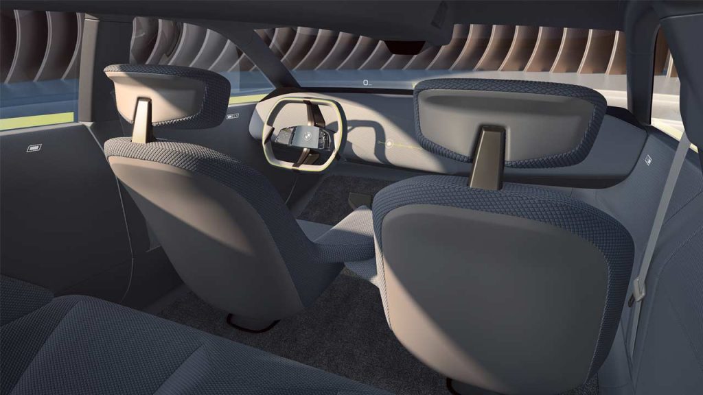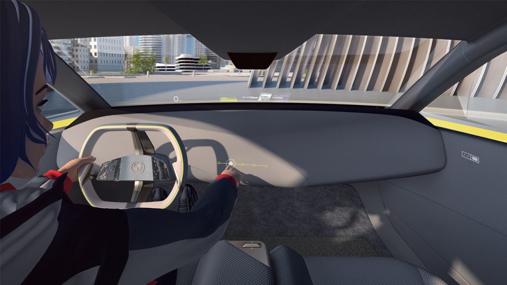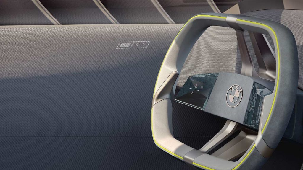 The same, minimalistic or “reductive design” philosophy applies on the inside too with so-called phygital controls replacing the physical ones. For example, notice that the door handles and window controls are simply touch controls. The unconventional steering also has these phygital touchpoints over some kind of crystal design elements. Another key highlight on the inside is an advanced Head-up Display—which allows the user to choose how much digital content they want to see on the windscreen. Notice those 5 touchpoints (dubbed shy-tech sensors) on the dashboard? Well, that’s how you choose what you want on your HUD. The HUD can extend across the full width of the windscreen, offering a glimpse of what to expect in the upcoming BMW models.