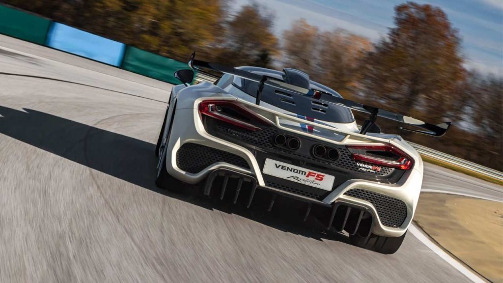 The Venom F5 Revolution is powered by the same 6.6L twin-turbo V8 ‘Fury’ engine that pumps out the same 1,355 kW (1817 bhp/1,842 metric hp) and 1,617 Nm (1,193 lb-ft) of torque as the regular Venom F5 Coupe. However, the track-focused version claims a dry weight of less than 3,000 pounds (<1,360 kg) as opposed to the regular model’s 3,000 pounds (1,360 kg). The top speed is claimed to be over 250 mph (402+ km/h).