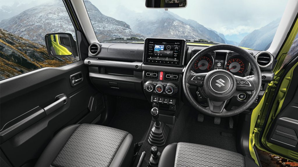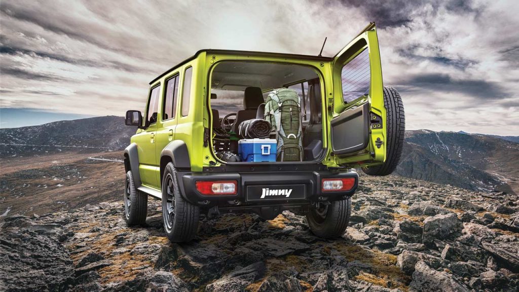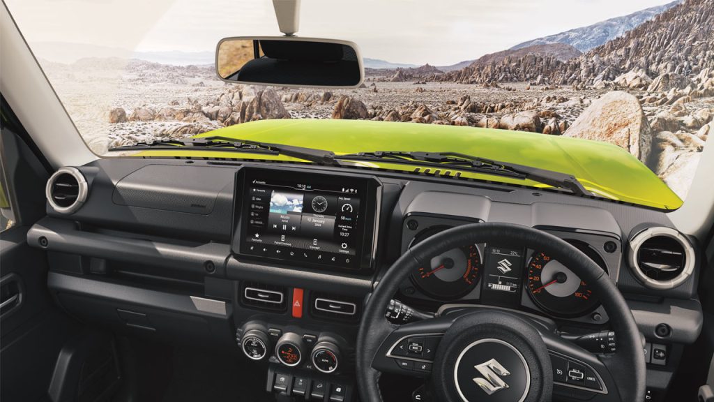 Moving on to the juicy bits of the story, the Jimny 5-door in India is powered by a 1.5-litre 4-cylinder naturally aspirated petrol engine that offers 77 kW (105 metric hp) and 134 Nm (99 lb-ft) of torque. Compare these figures with mStallion 150 engine’s (Thar petrol) 112 kW (152 metric hp) and 300 Nm (221 lb-ft). But anyway, the 1.5L engine can be coupled with either a 5-speed manual or a 4-speed automatic gearbox. AllGrip Pro 4WD system (with low-range transfer) comes standard.