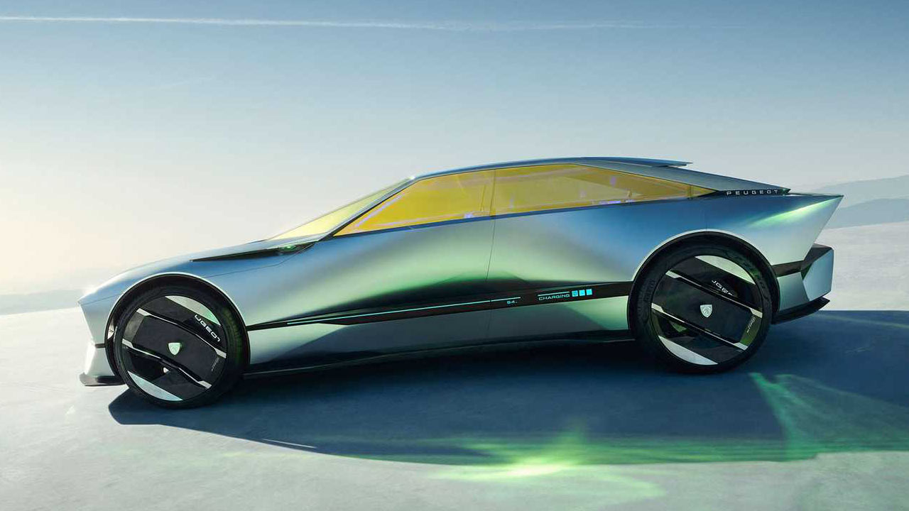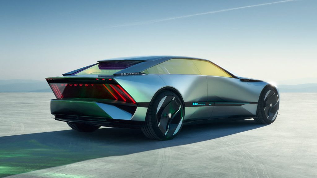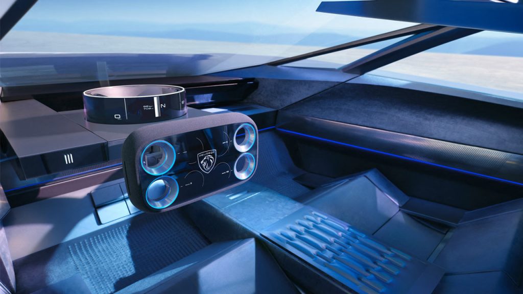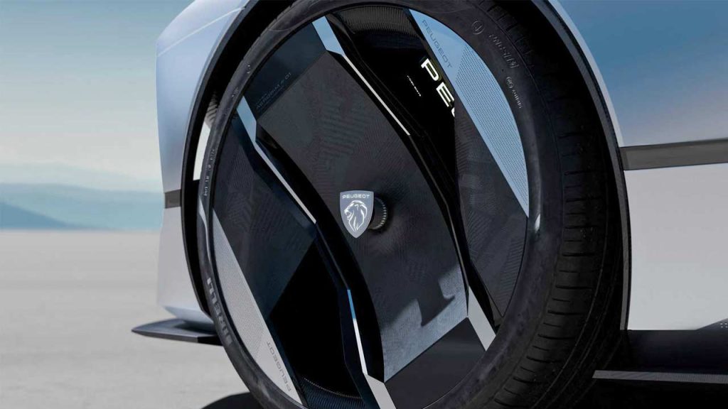 The concept rides on 20-inch ‘Aerorim’ aerodynamic wheels featuring forged textile and aluminium inserts; the latter has micro-perforations. Notice the charging indicator on the side as well. Peugeot calls the horizontal bar on the side a ‘Tech Bar’, featuring a small display that displays different messages when the driver and passengers approach it. The rest of the things might be stupid, but I’m thoroughly digging the design.