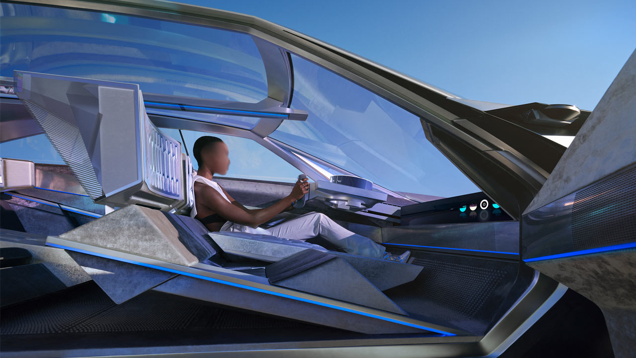 On the inside, well, things look rather complicated and hard to understand. But I’ll try my best to explain in the simplest terms. What we are seeing on the dashboard is a futuristic iteration of Peugeot’s i-Cockpit. Peugeot calls that video game controller-like steering ‘Hypersquare’; it has got four circles for controlling different functionalities. There’s also a circular instrument display called ‘Halo Cluster’. Why is it circular? Well, it apparently offers information to the passengers approaching the car. And of course, at the touch of a button, both the Hypersquare and the Halo Cluster retract to make way for a large panoramic screen to entertain the passengers in autonomous driving mode. Those strange looking seats are apparently a futuristic take on the armchairs, featuring active air bolsters and storage spaces on the side.
